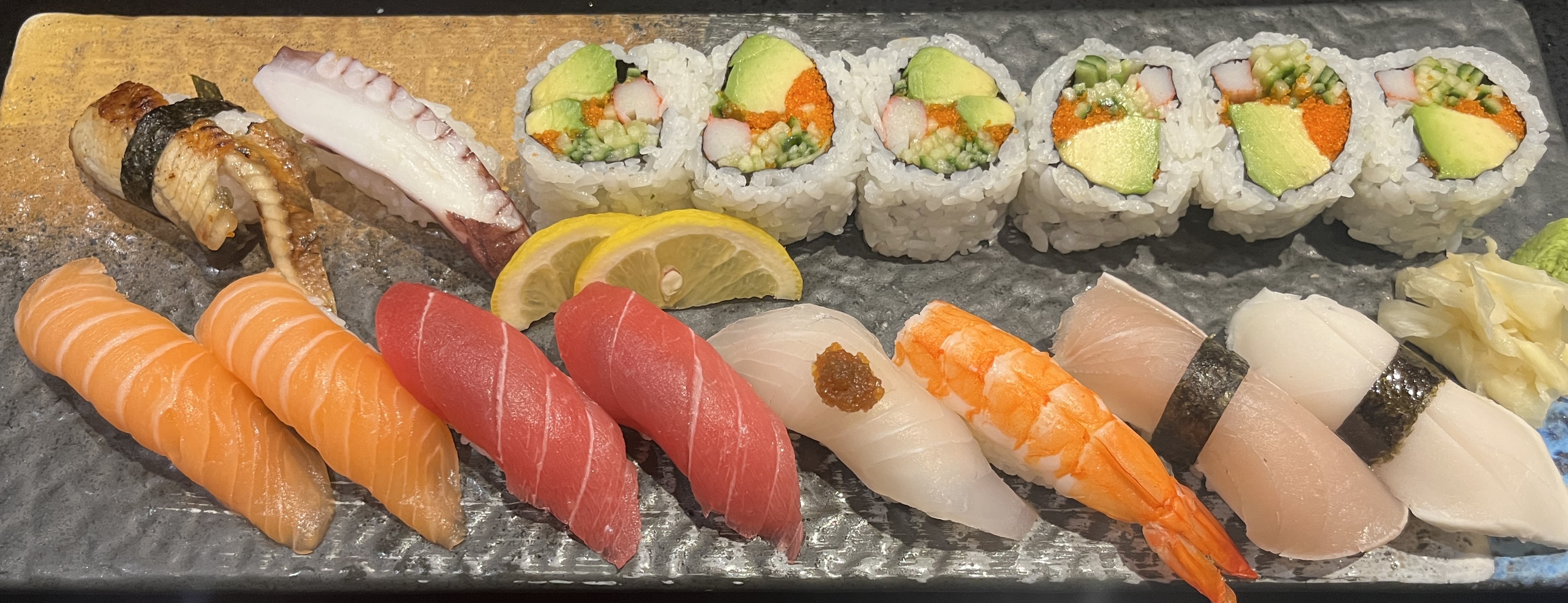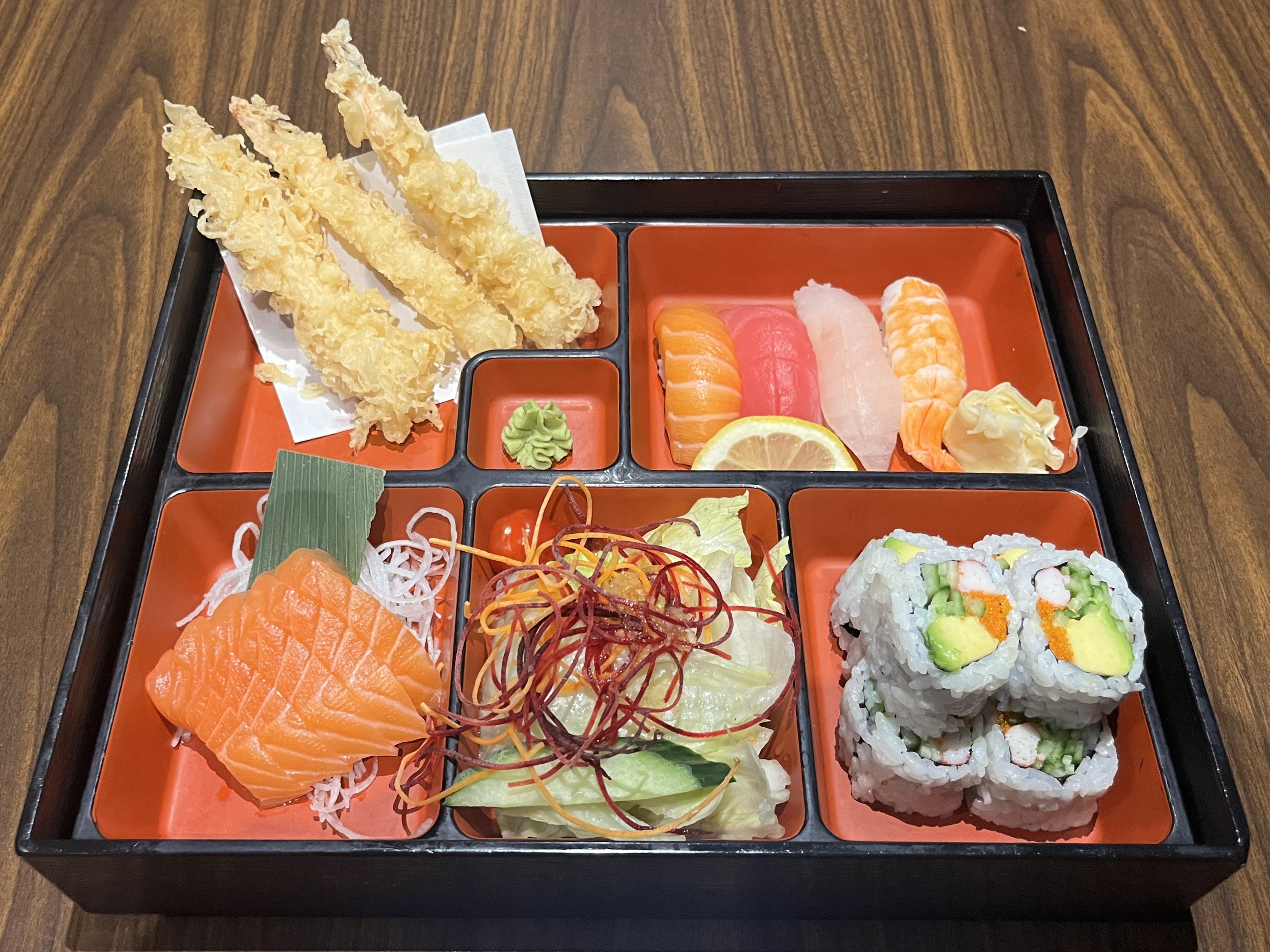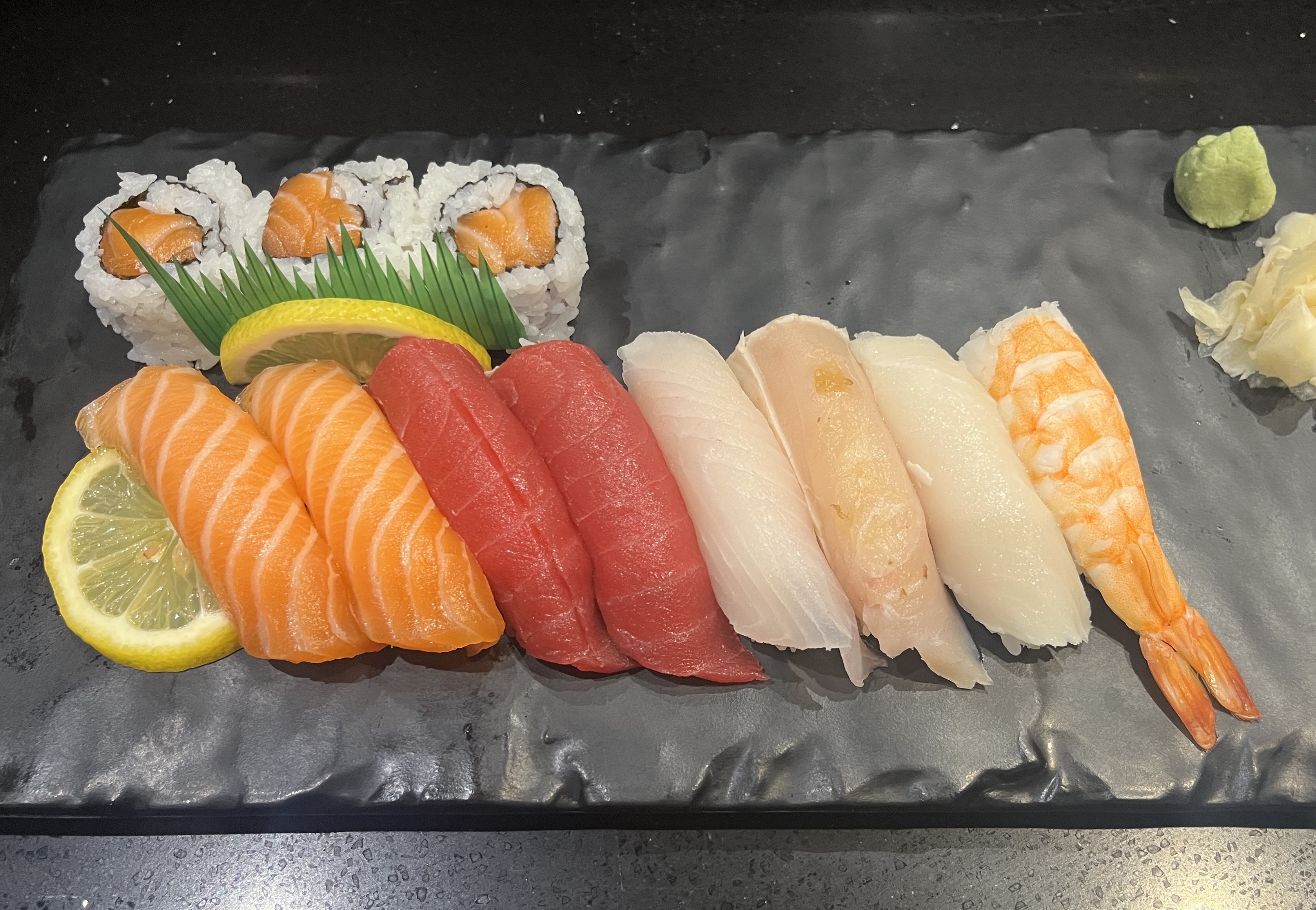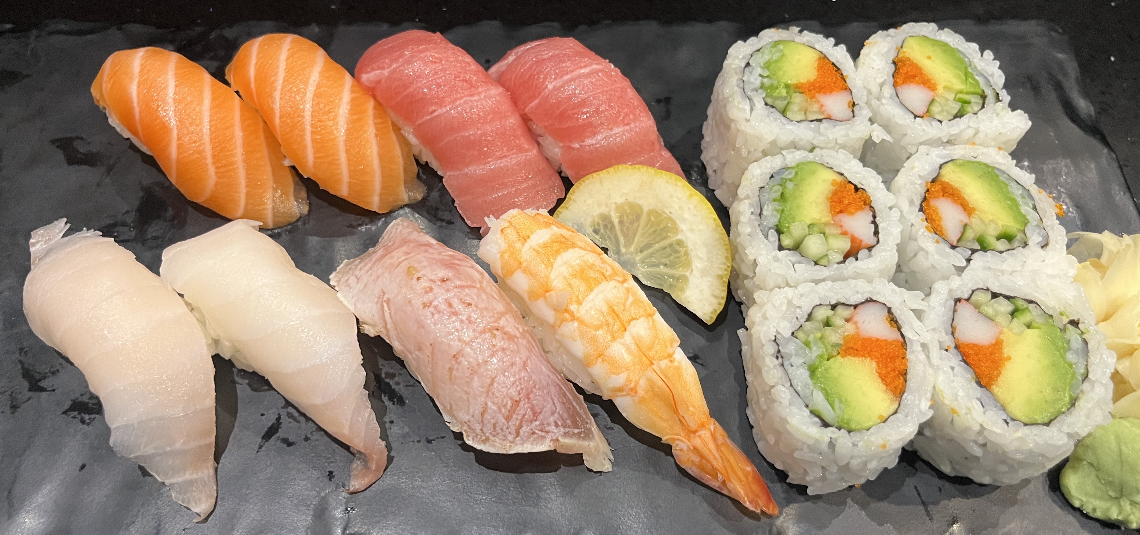 5pcs salmon sashimi, 4 pcs nigiri sushi, 3pcs shrimp tempura, 6pcs California maki (rice not included)