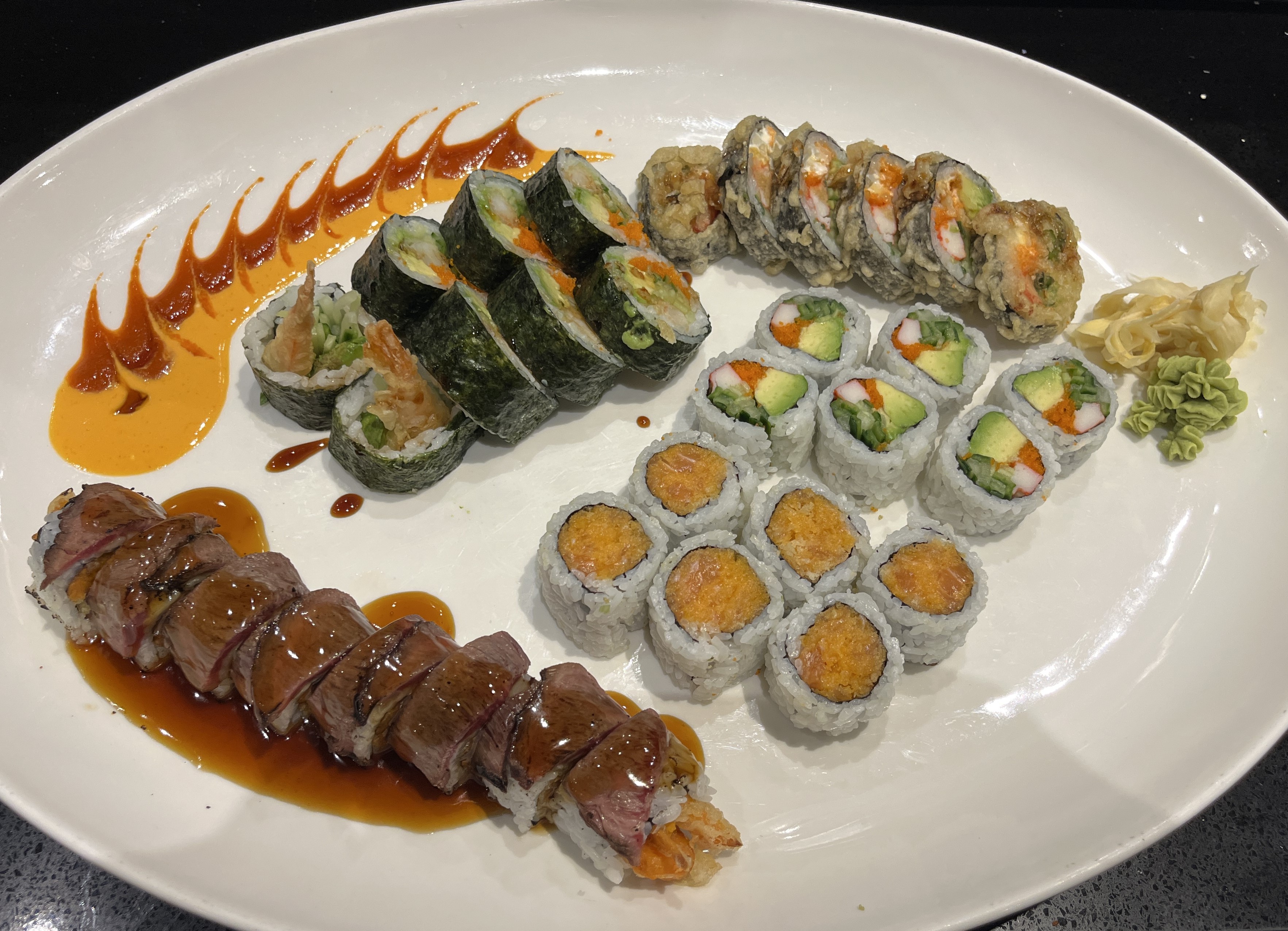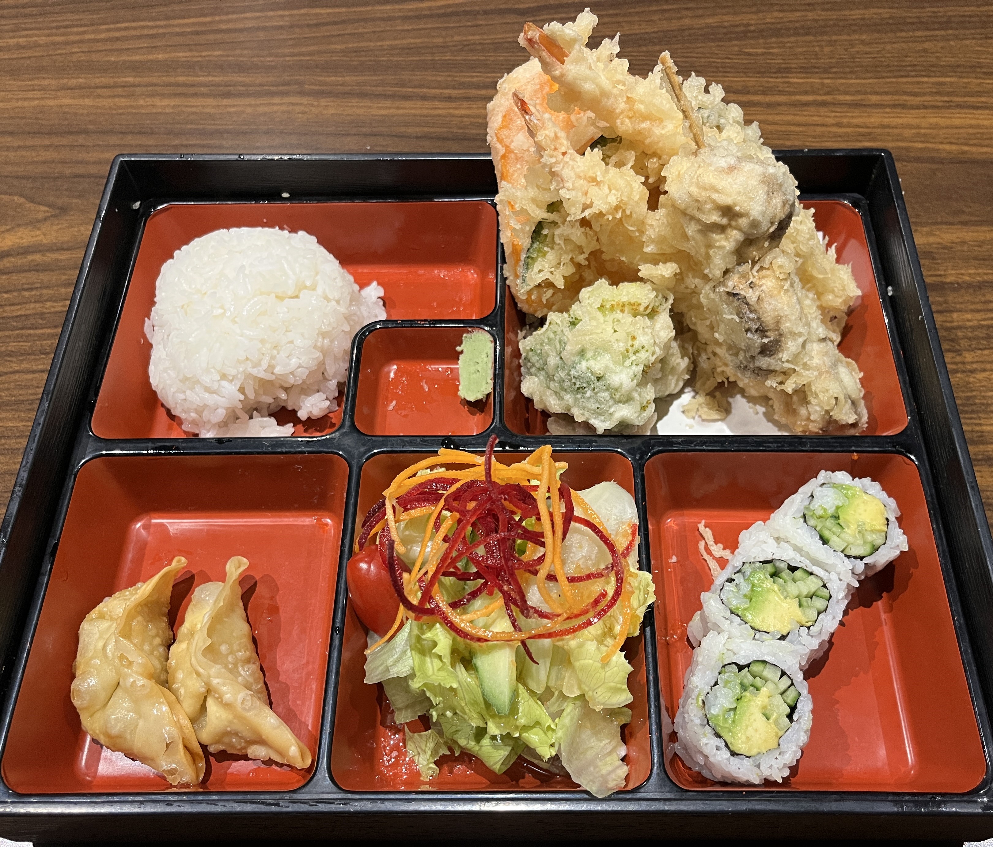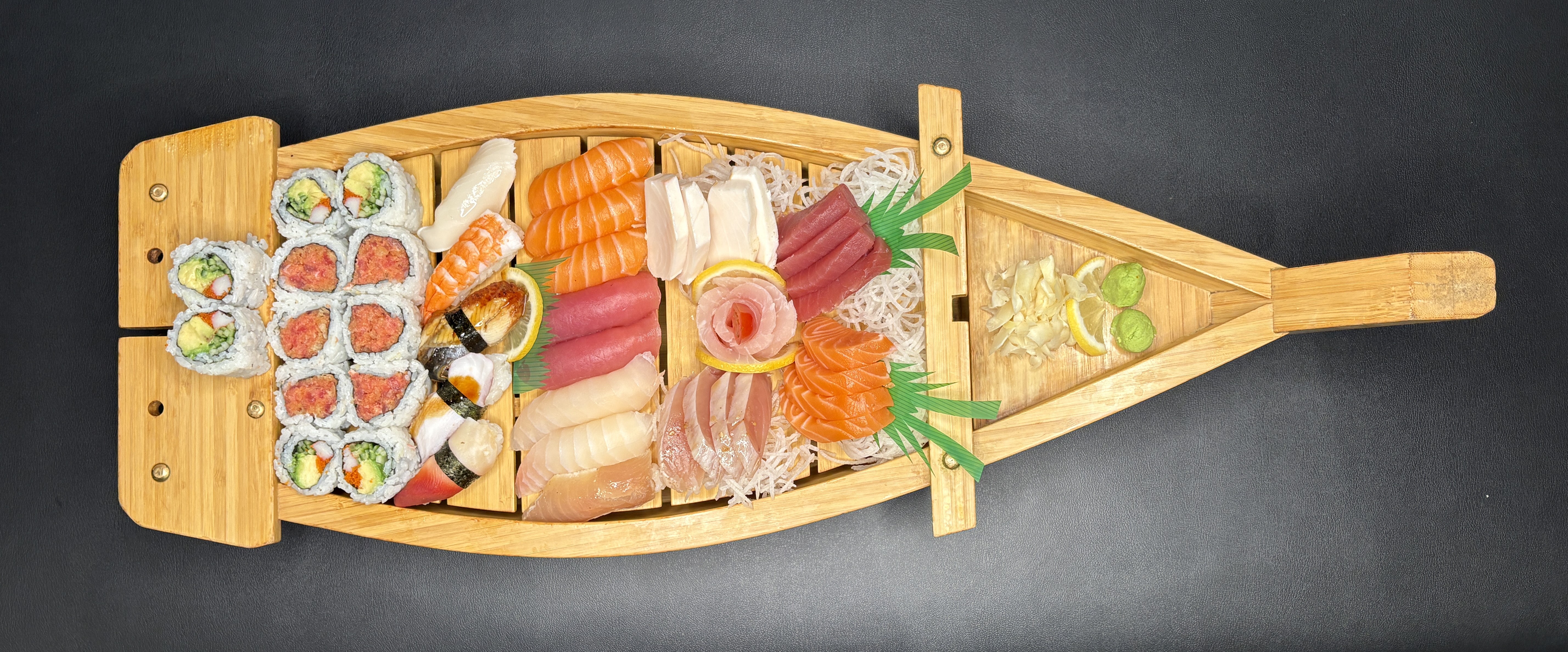 5pcs salmon sashimi, 4 pcs nigiri sushi, 3pcs shrimp tempura, 6pcs California maki (rice not included)