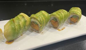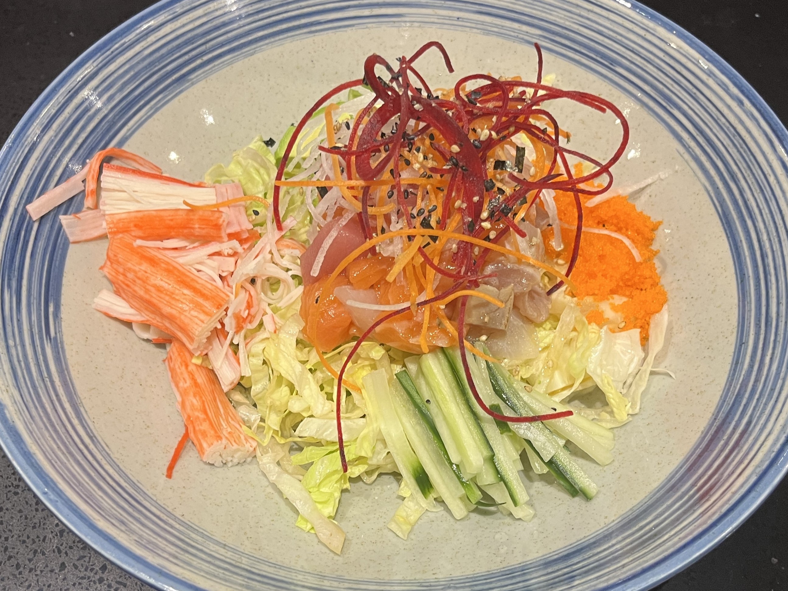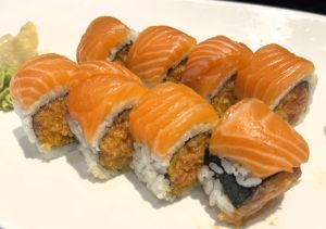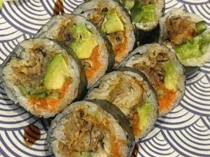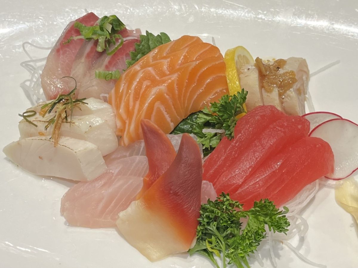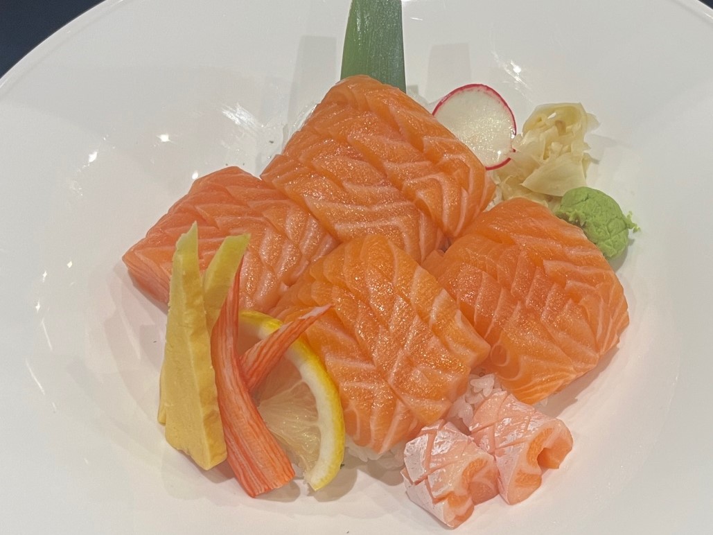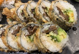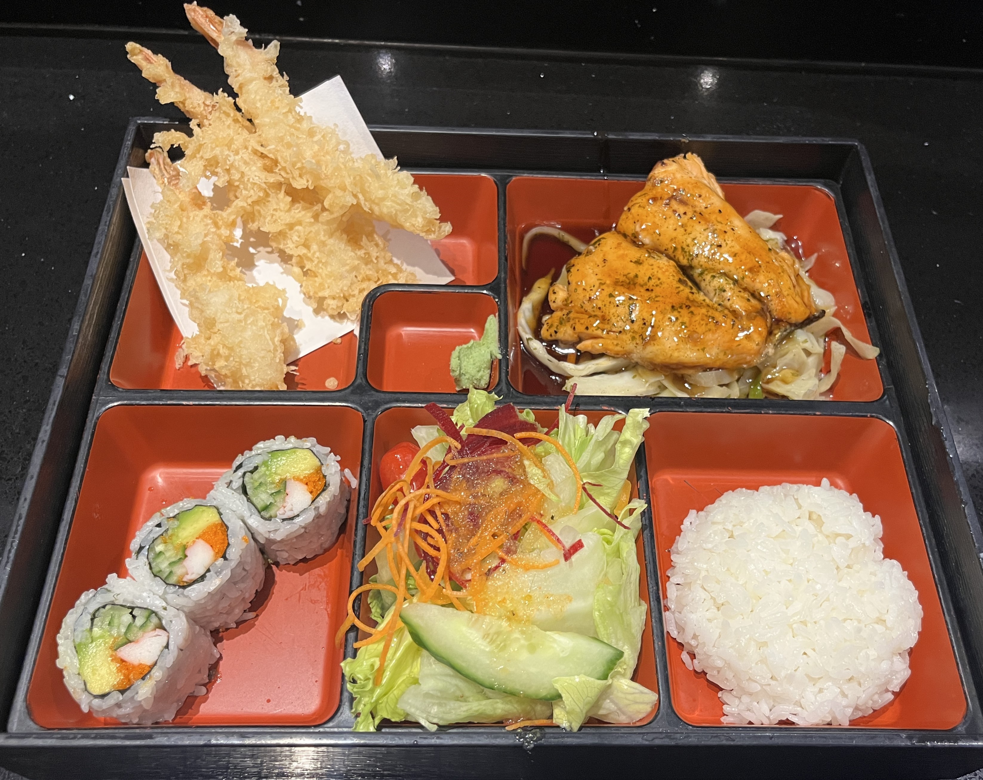 5pcs salmon sashimi, 4 pcs nigiri sushi, 3pcs shrimp tempura, 6pcs California maki (rice not included)