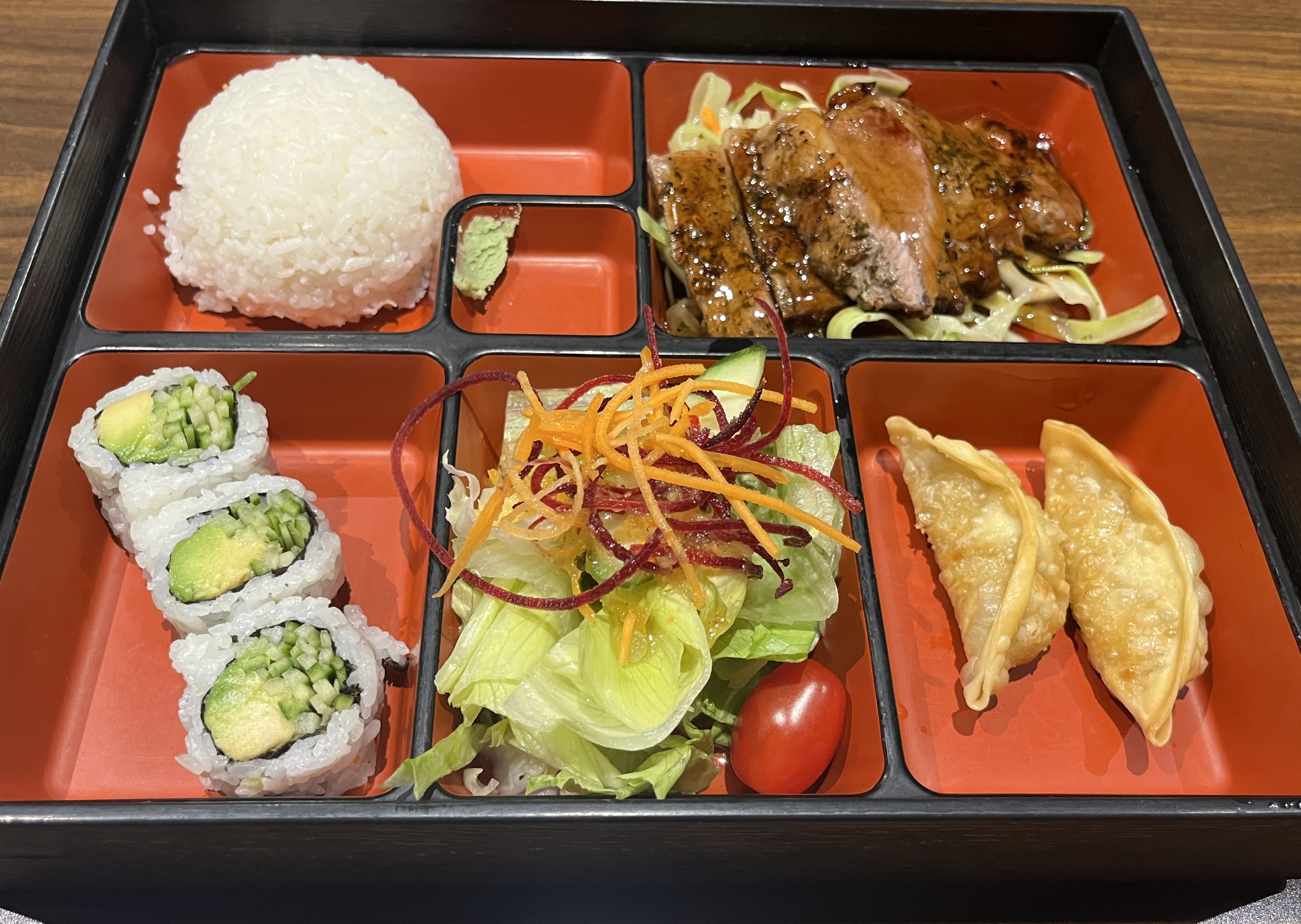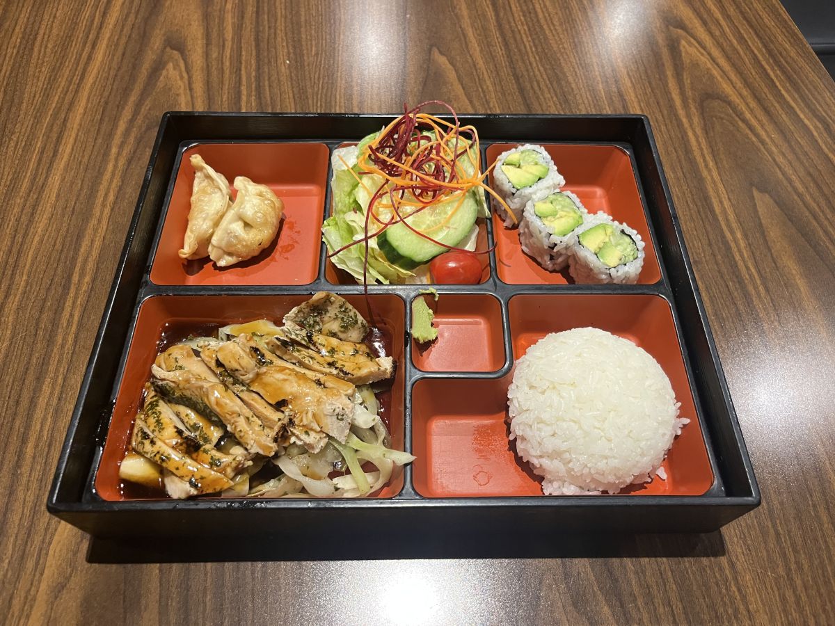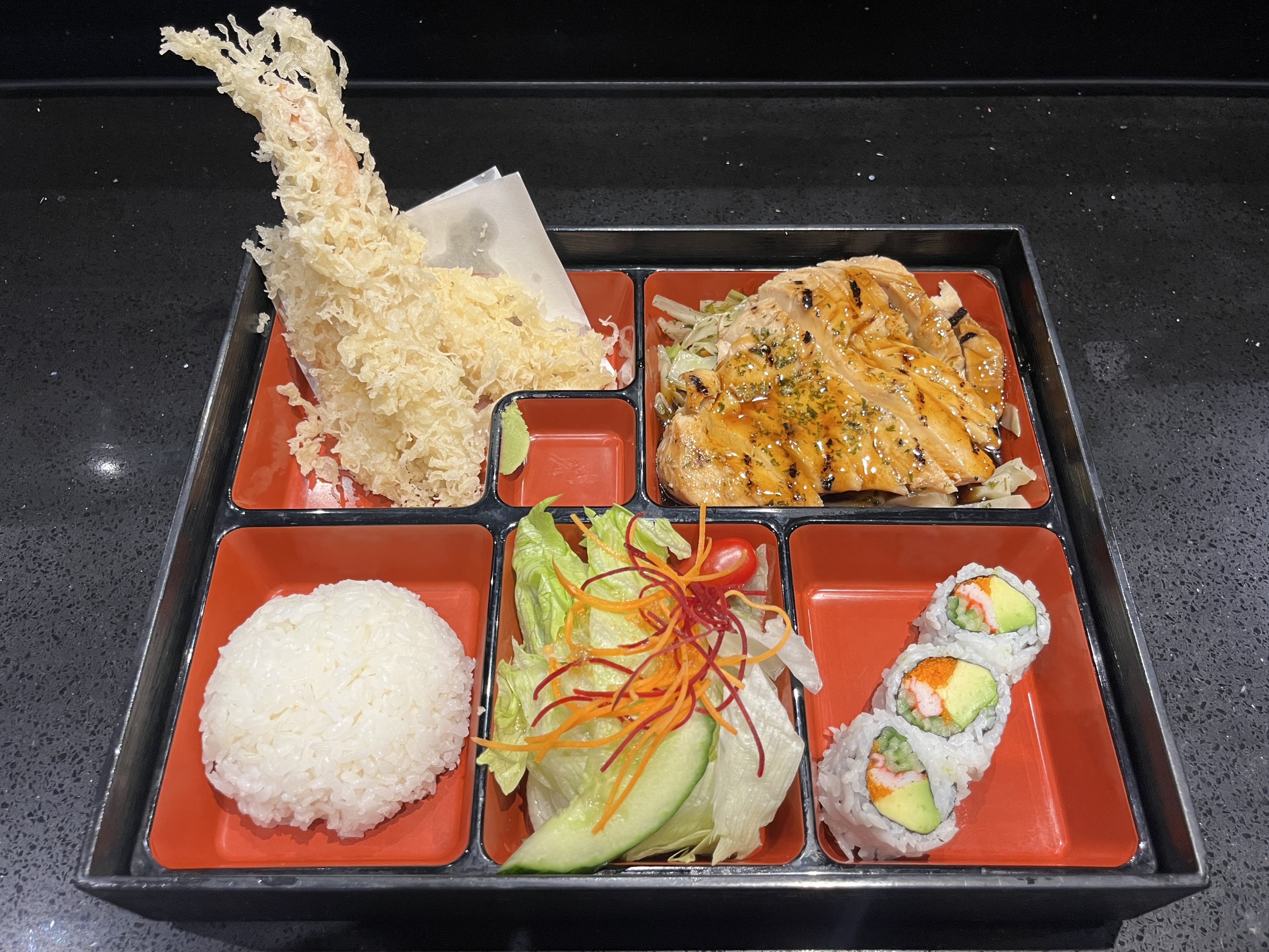 Grilled chicken with teriyaki, sauce, 3pcs shrimp tempura, 3pcs California maki