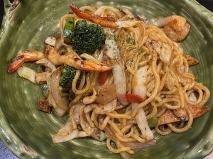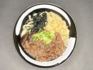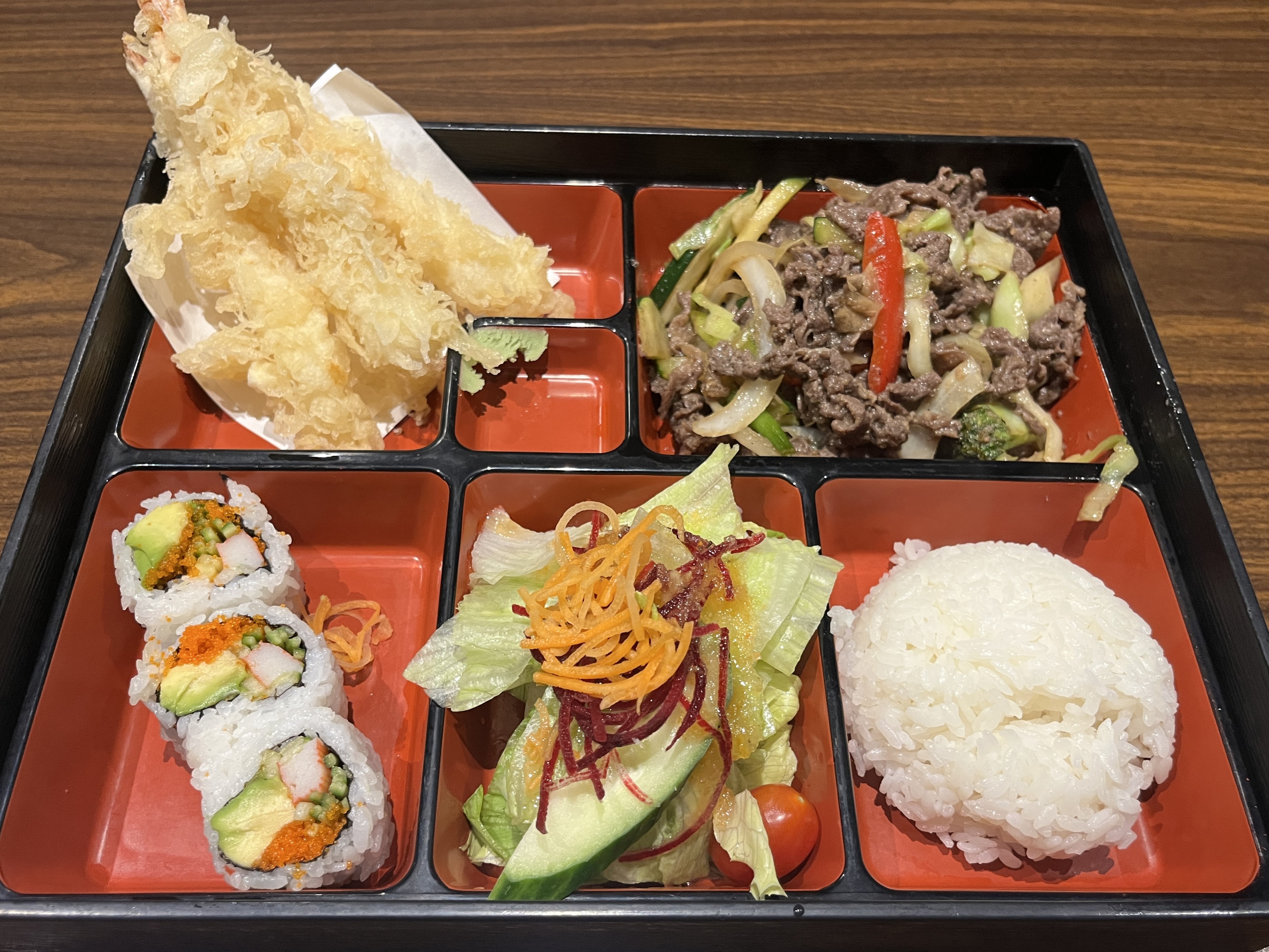 Stir fried marinated sliced beef rib-eye, 3 pcs shrimp tempura, 3pcs
