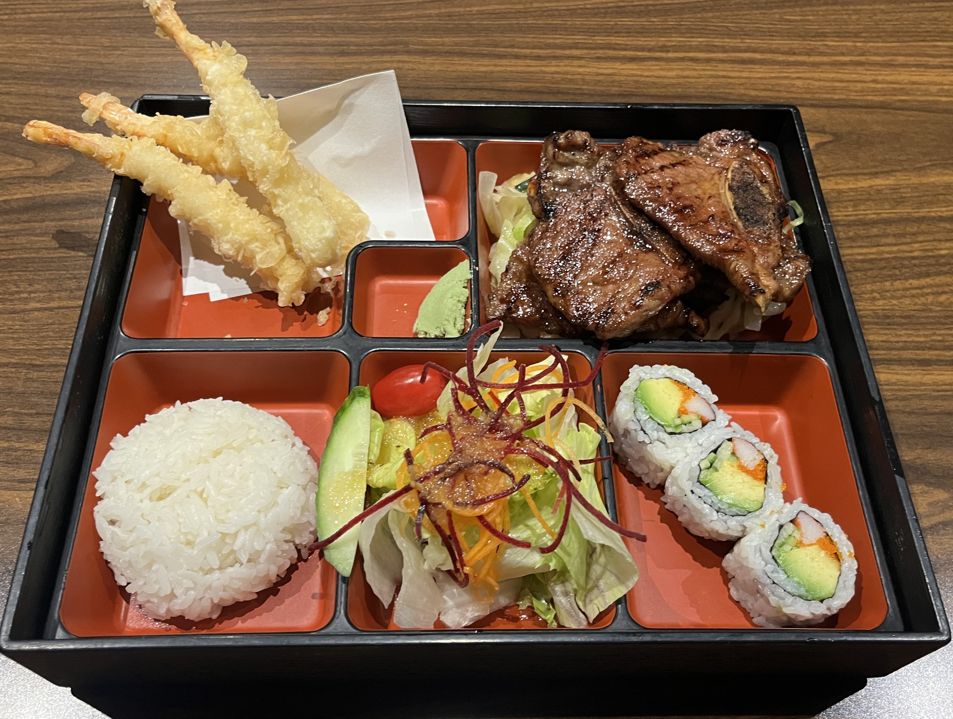 Grilled marinated beef short ribs, 3pcs shrimp tempura, 3pcs California maki