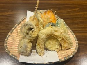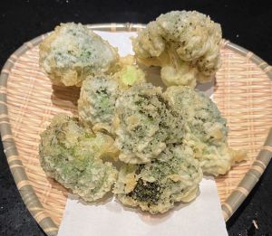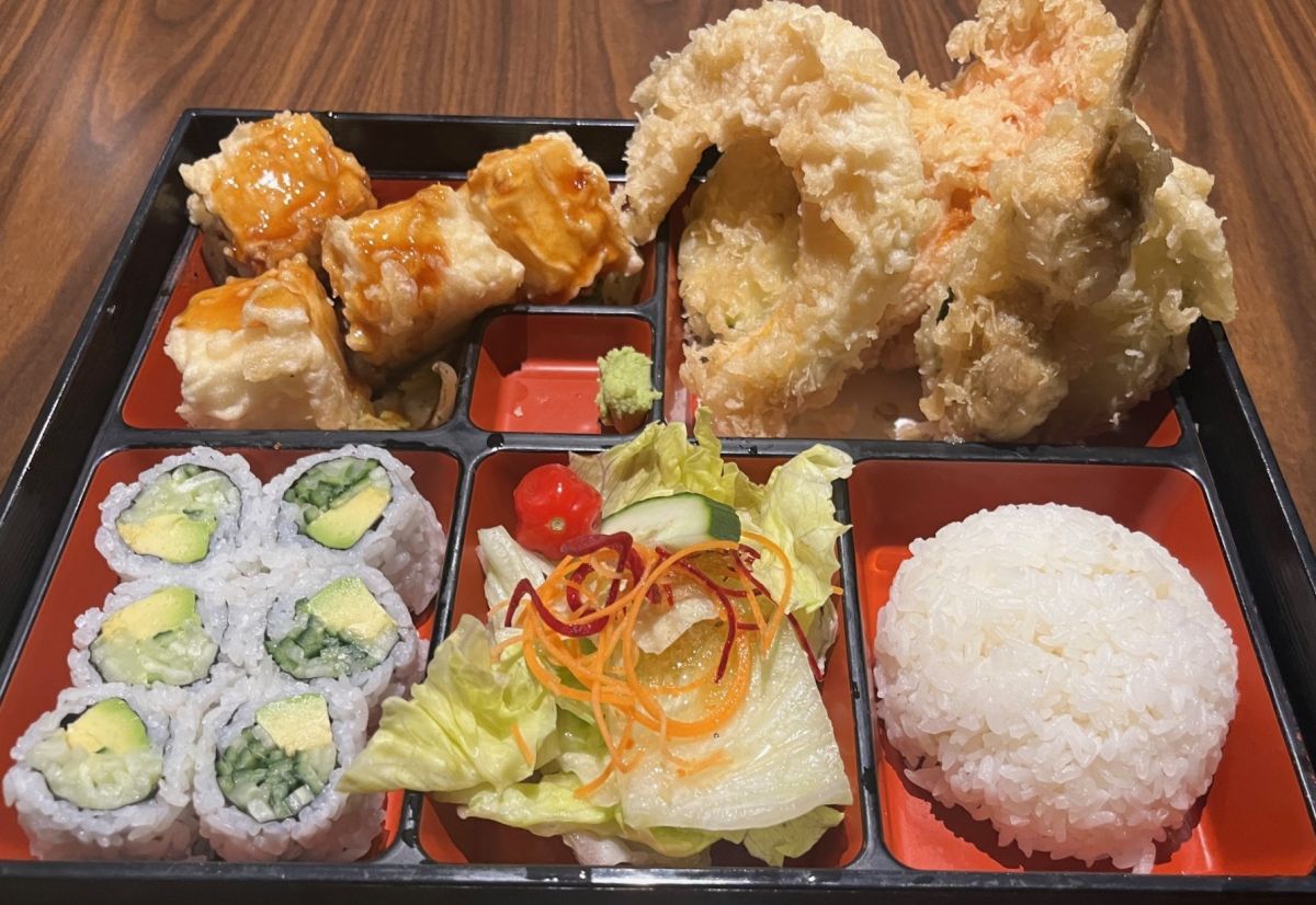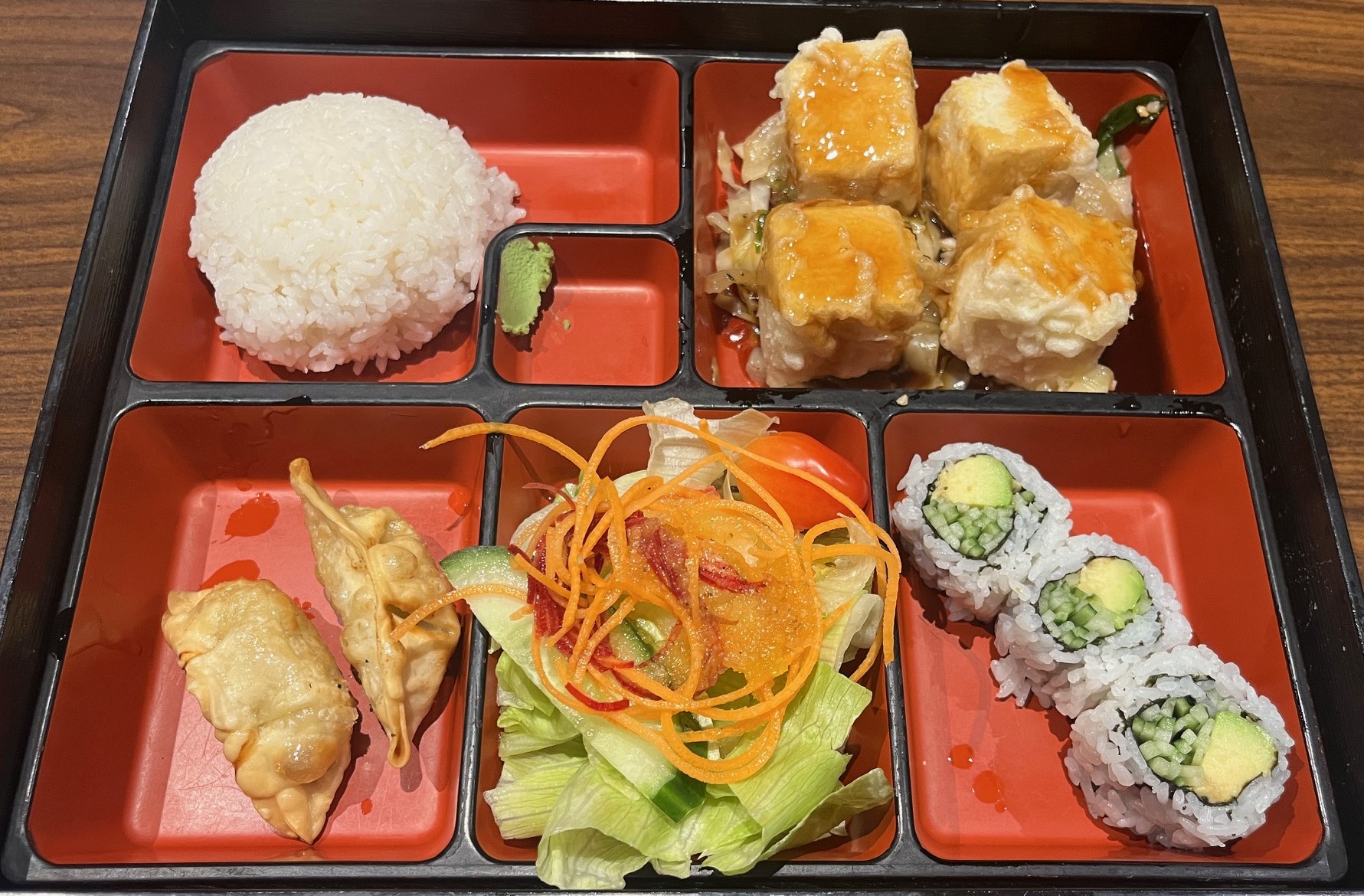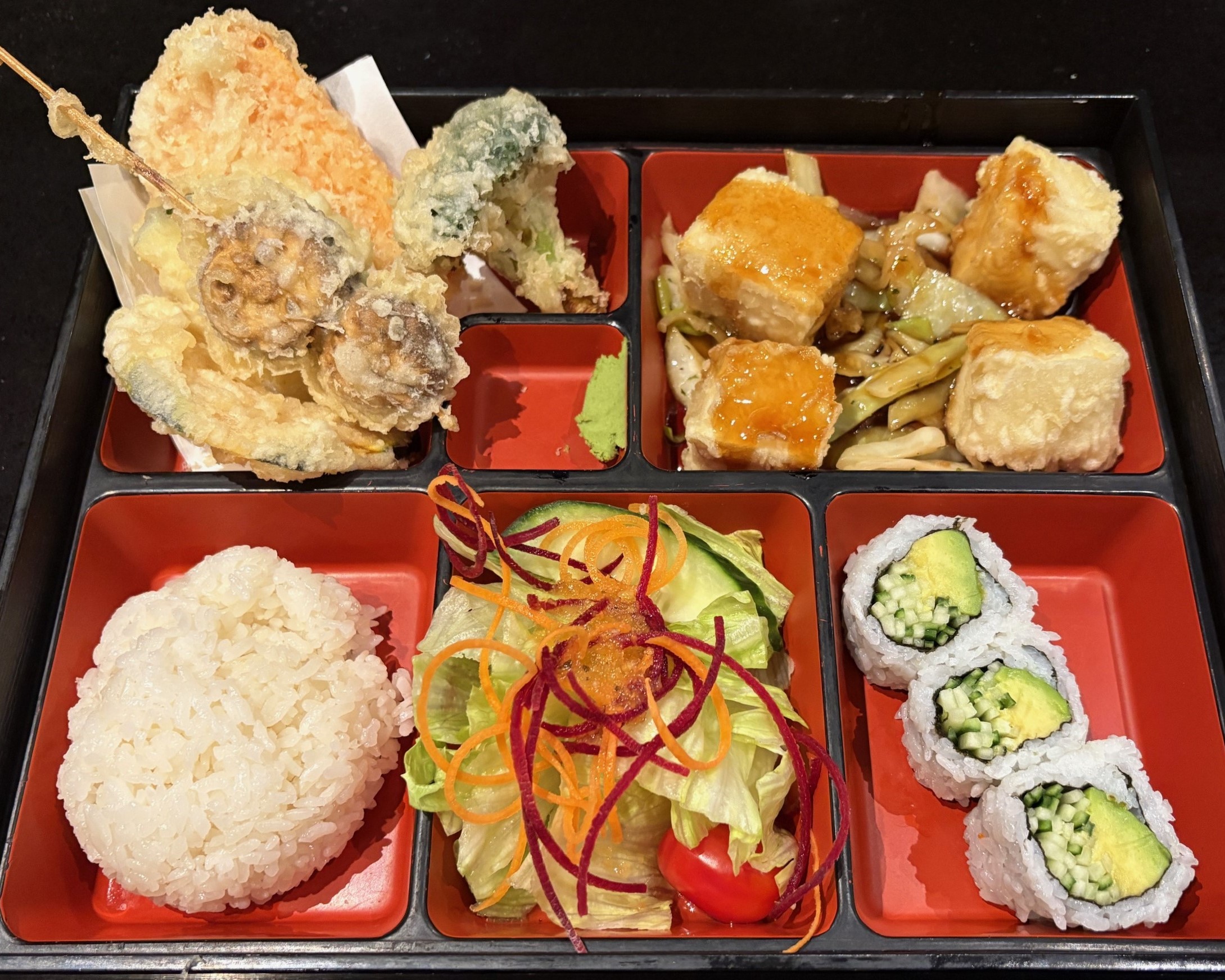 Crispy tofu, vegetables with teriyaki sauce, 5pcs vegetables tempura, 3pcs cucumber maki