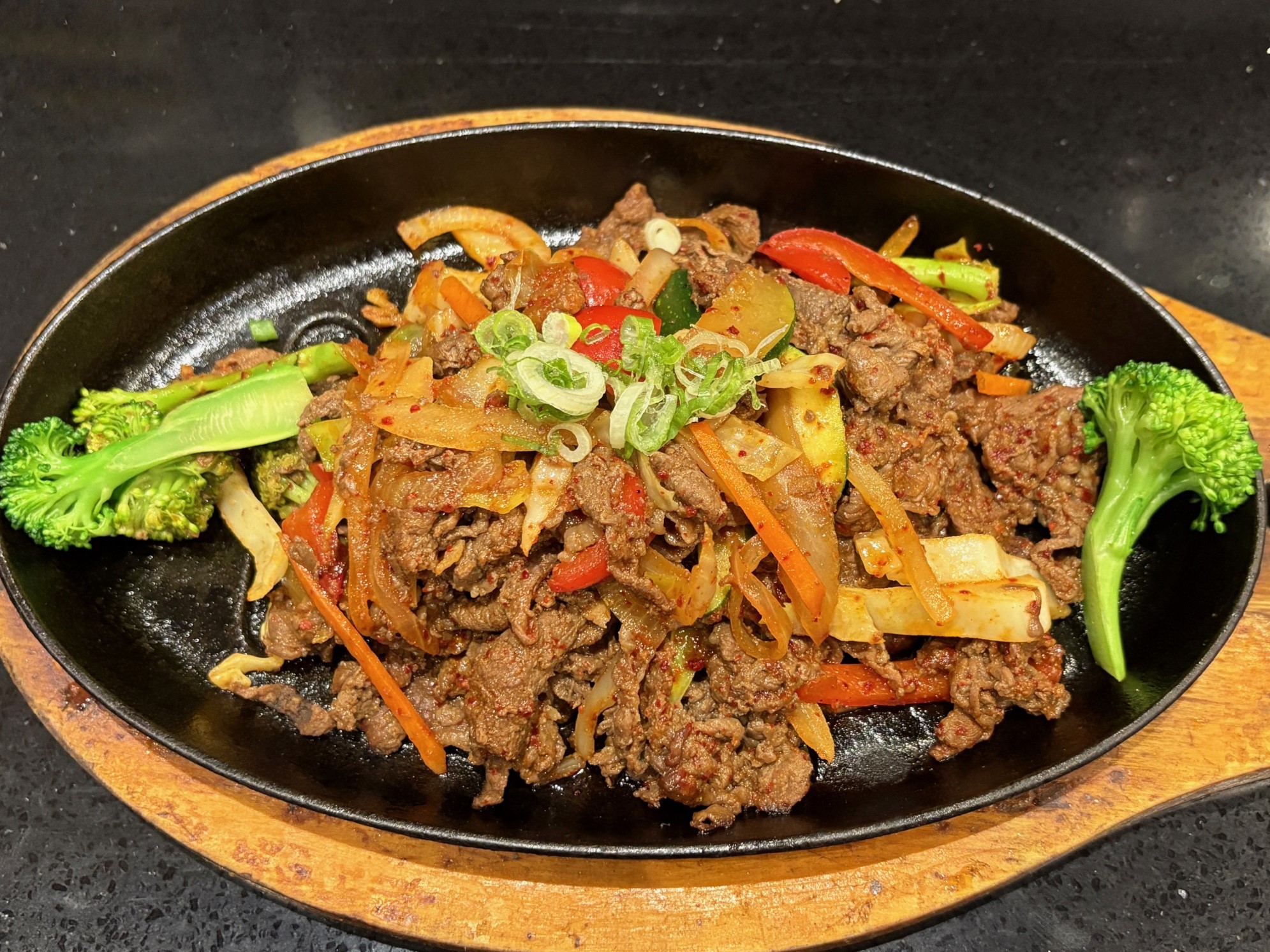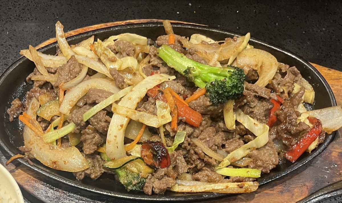 Stir fried marinated sliced beef rib-eye, vegetables, rice