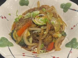 Stir fry glass noodles with vegetables in sweet soy sauce