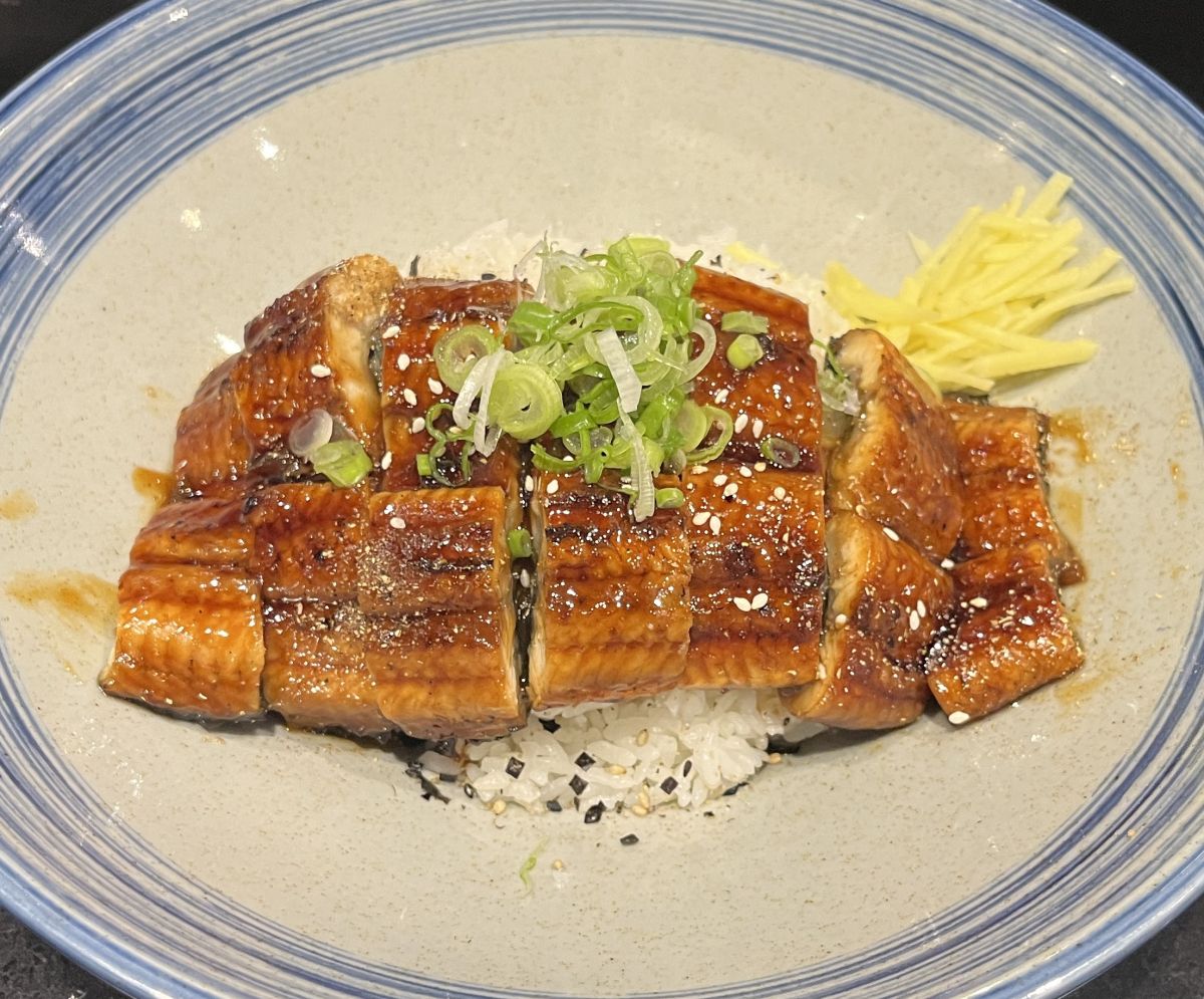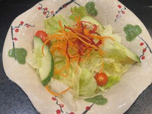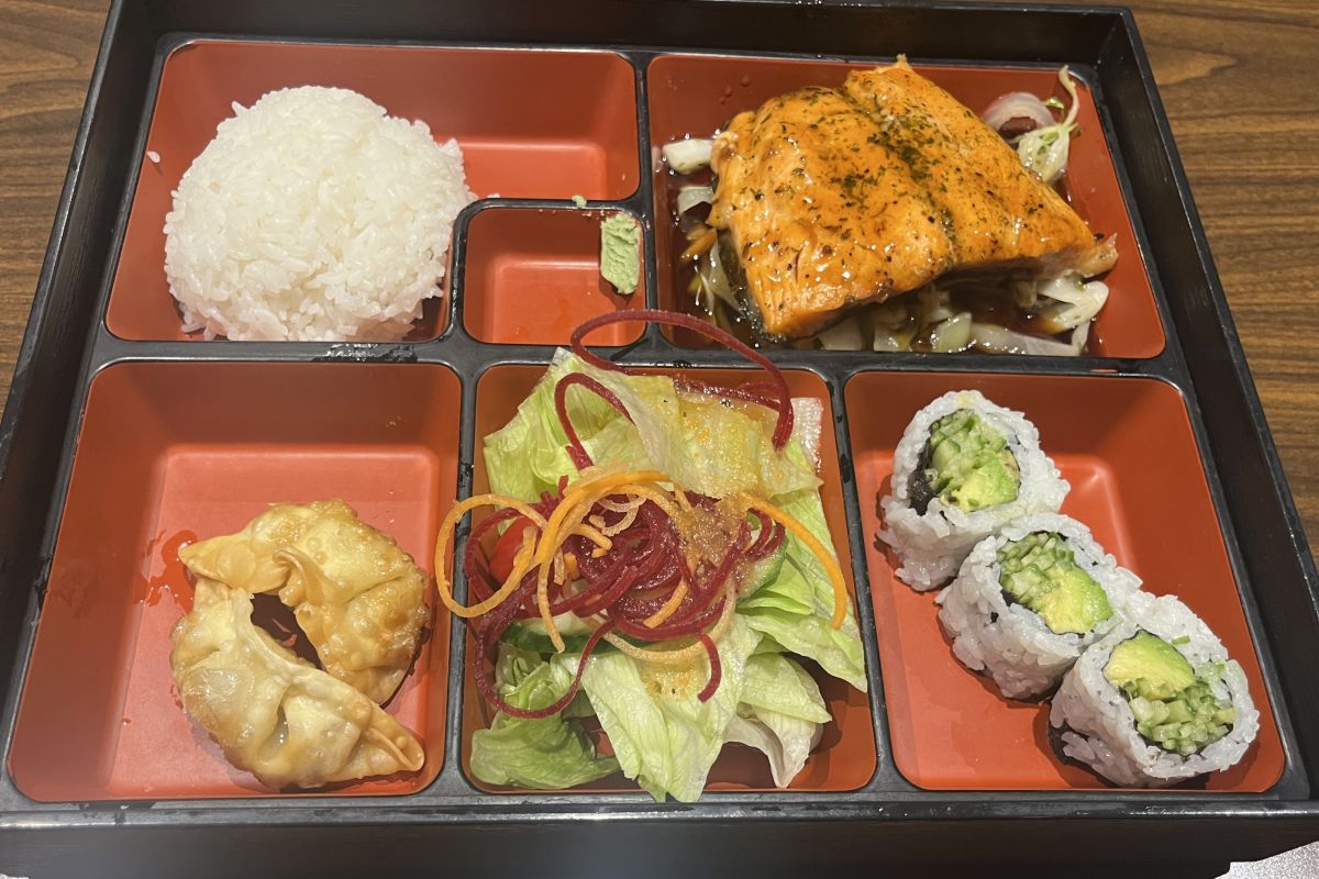 Grilled salmon with teriyaki sauce, 3pcs shrimp tempura, 3pcs California Maki
