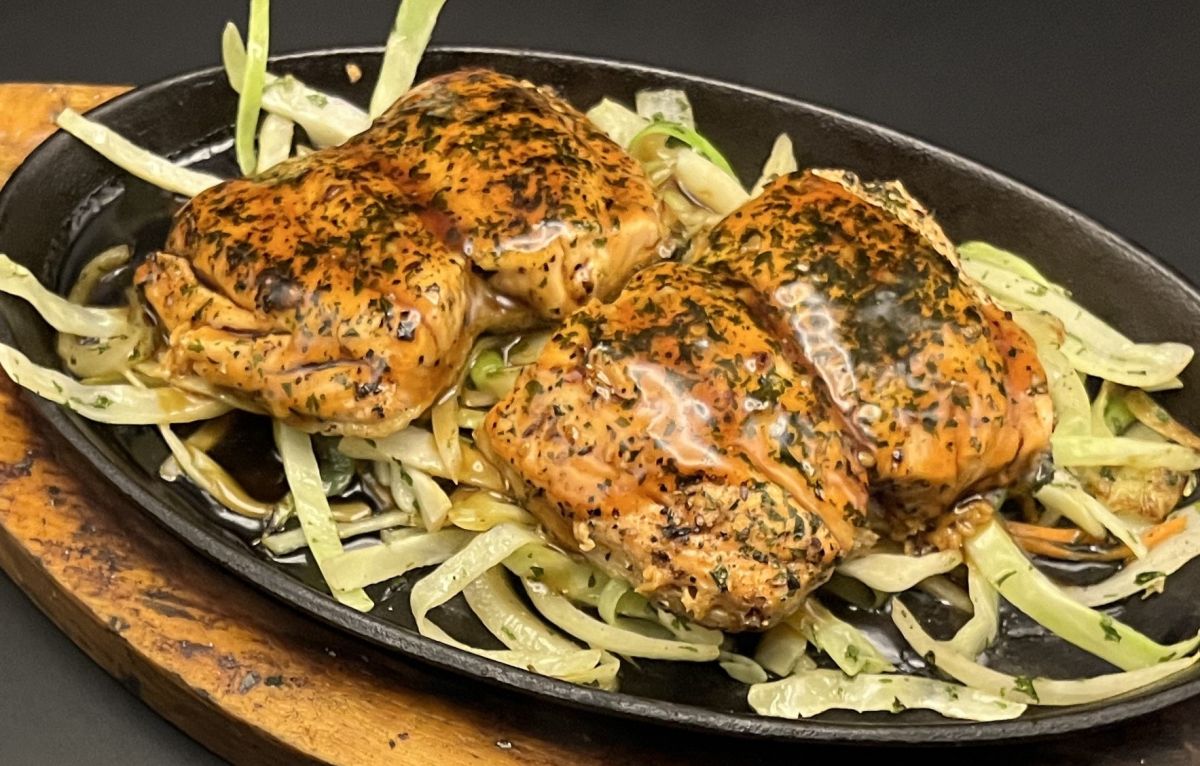 Grilled salmon, vegetables with teriyaki sauce, rice