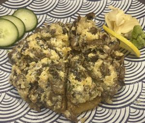 Shitake mushroom, crunch, mayo on crispy rice patty