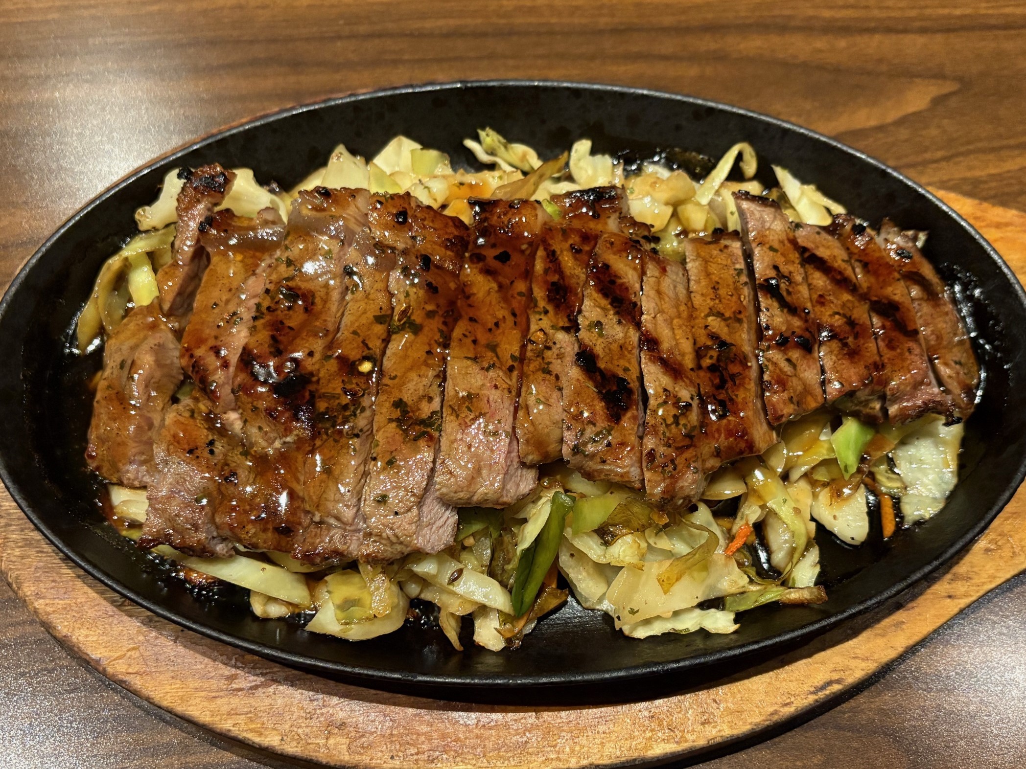 Grilled strip loin, vegetables with teriyaki sauce, rice