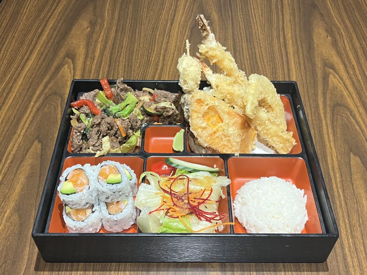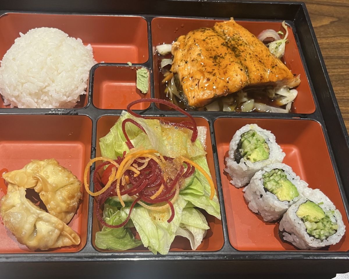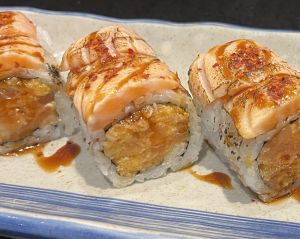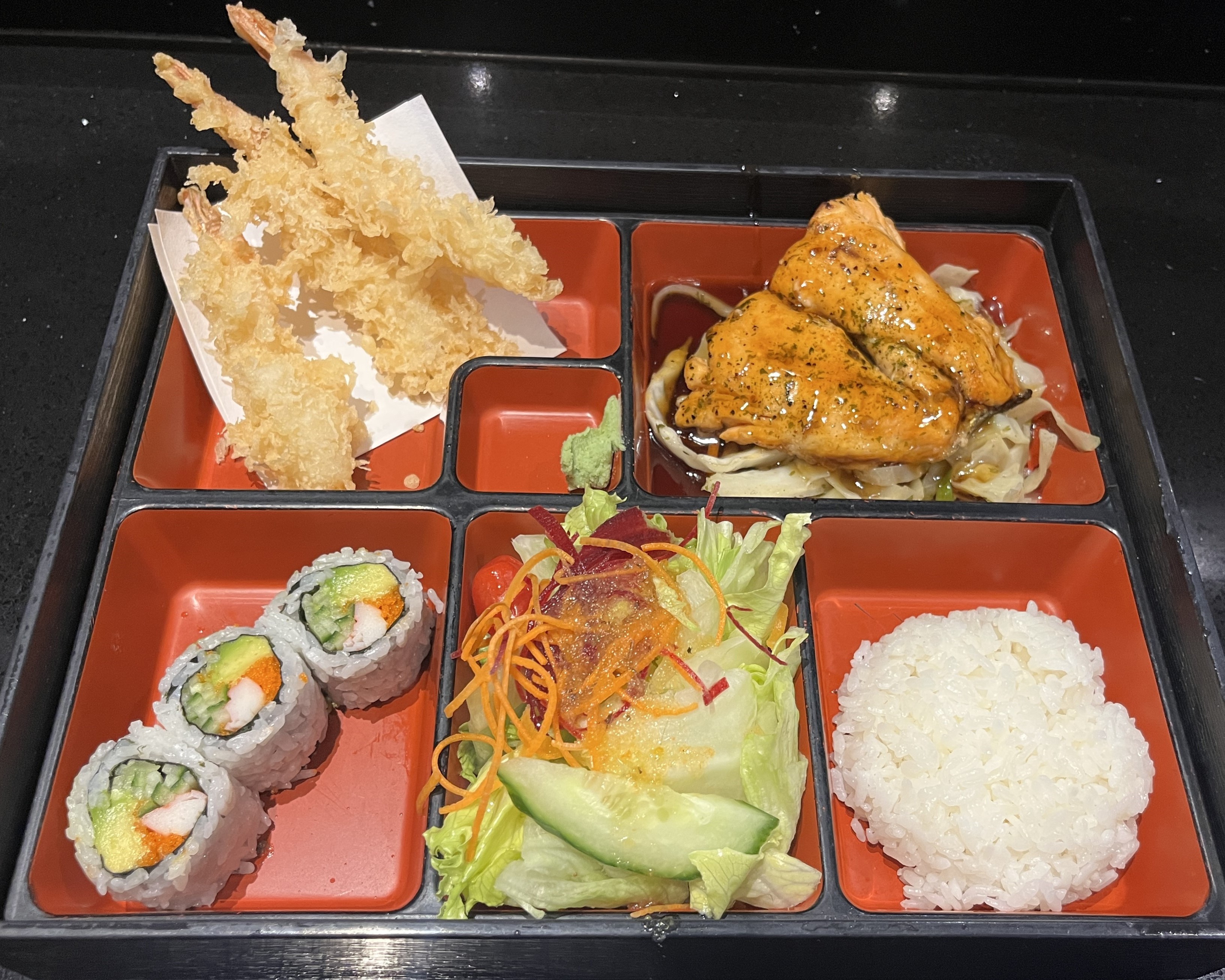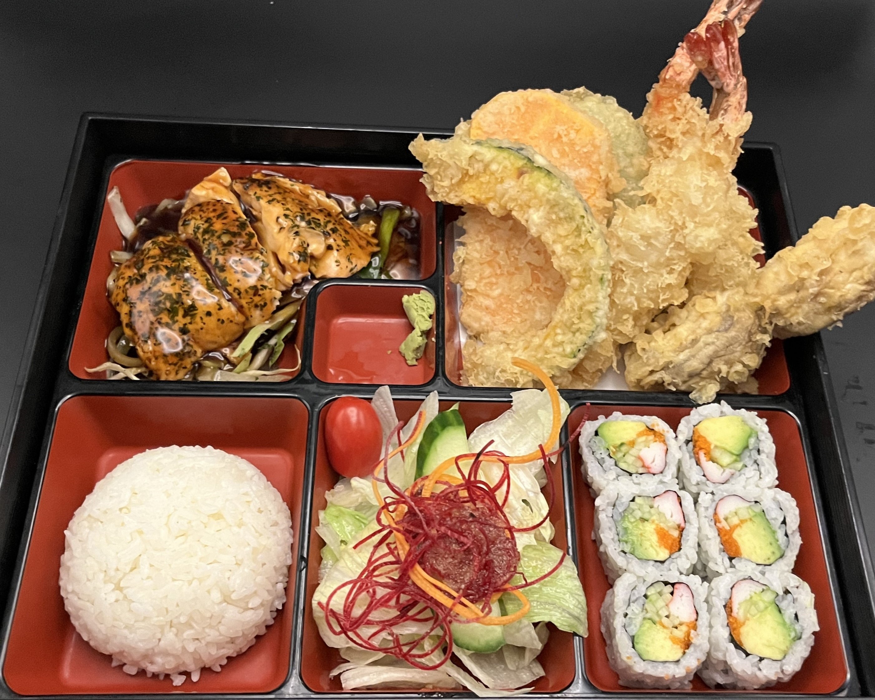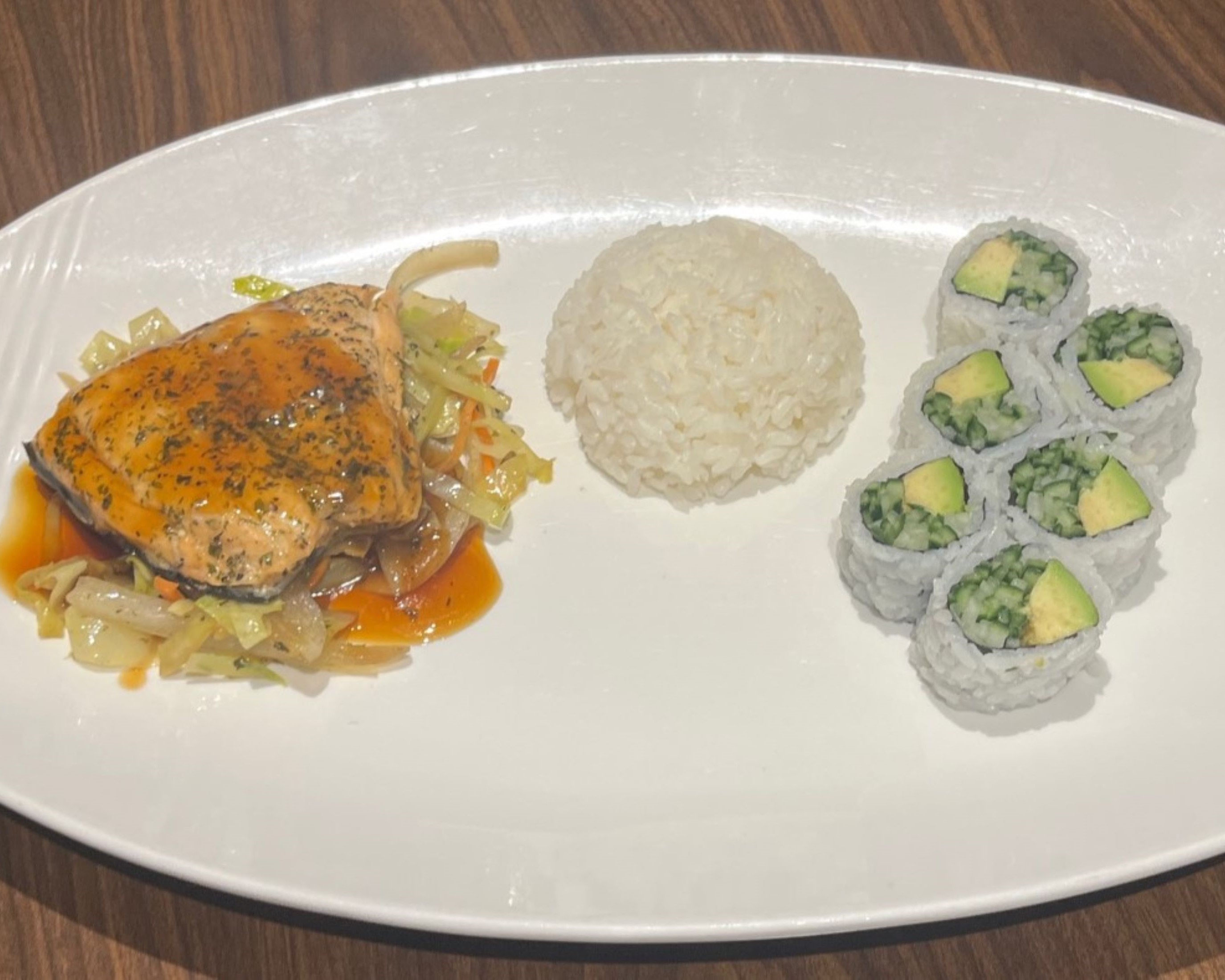 Grilled salmon with teriyaki sauce, 3pcs shrimp tempura, 3pcs California Maki