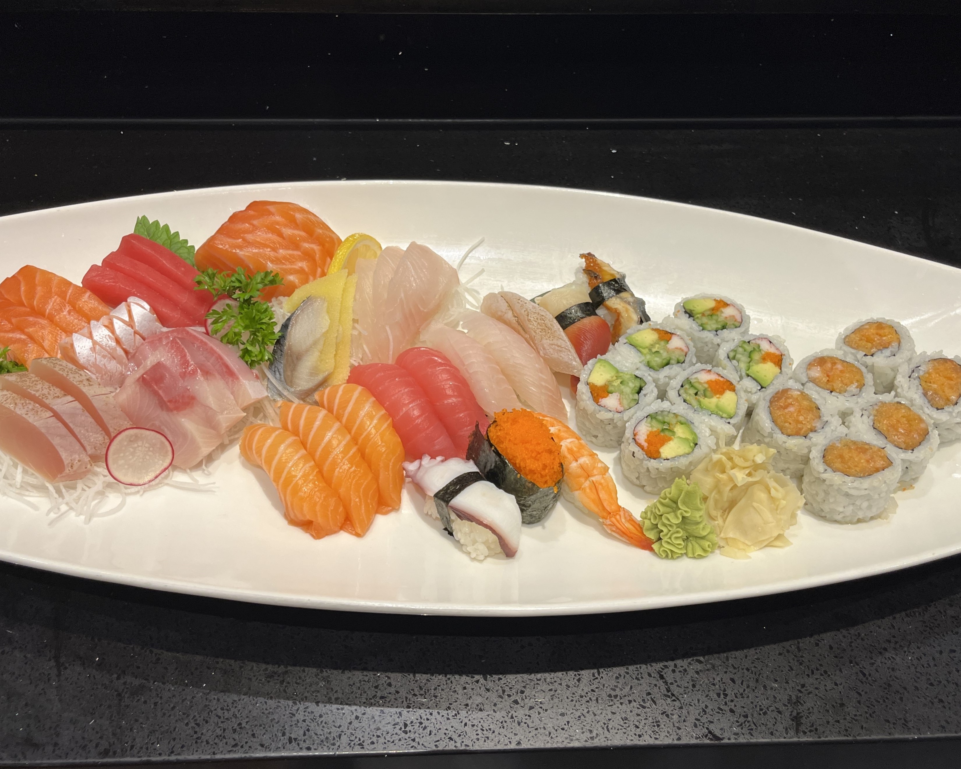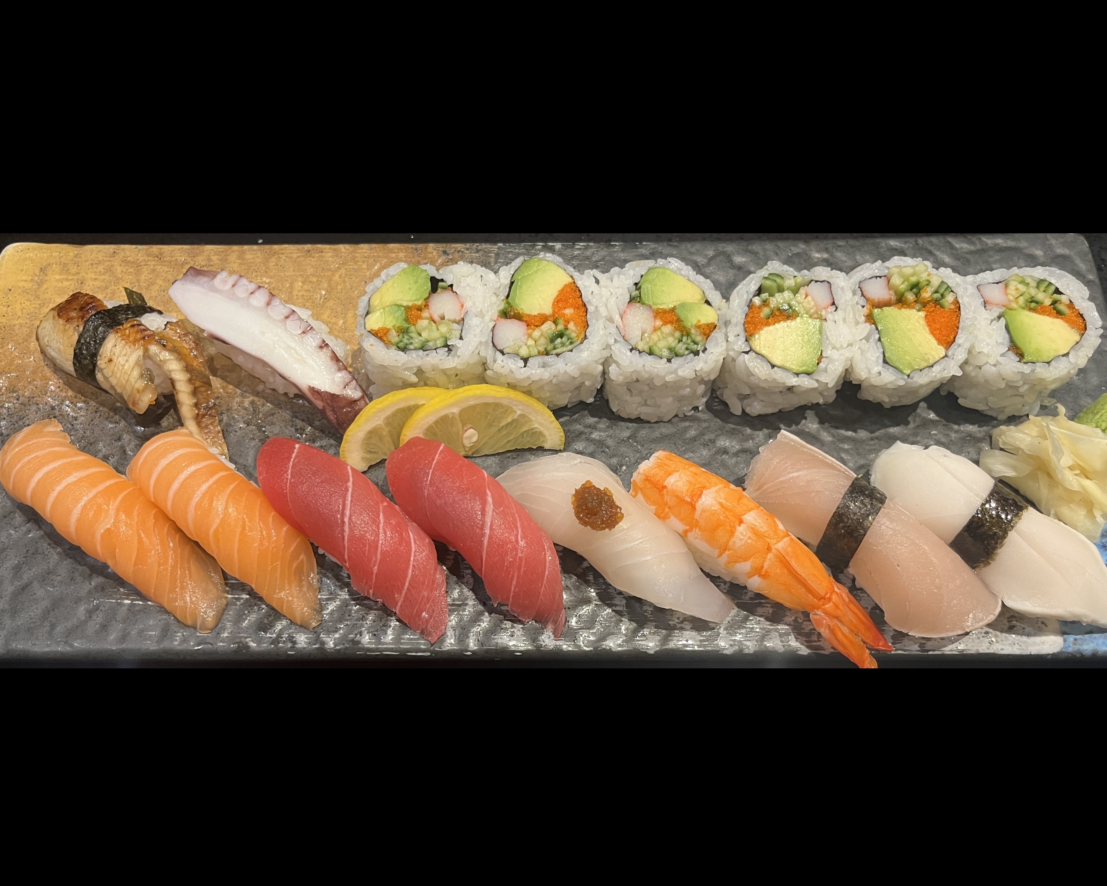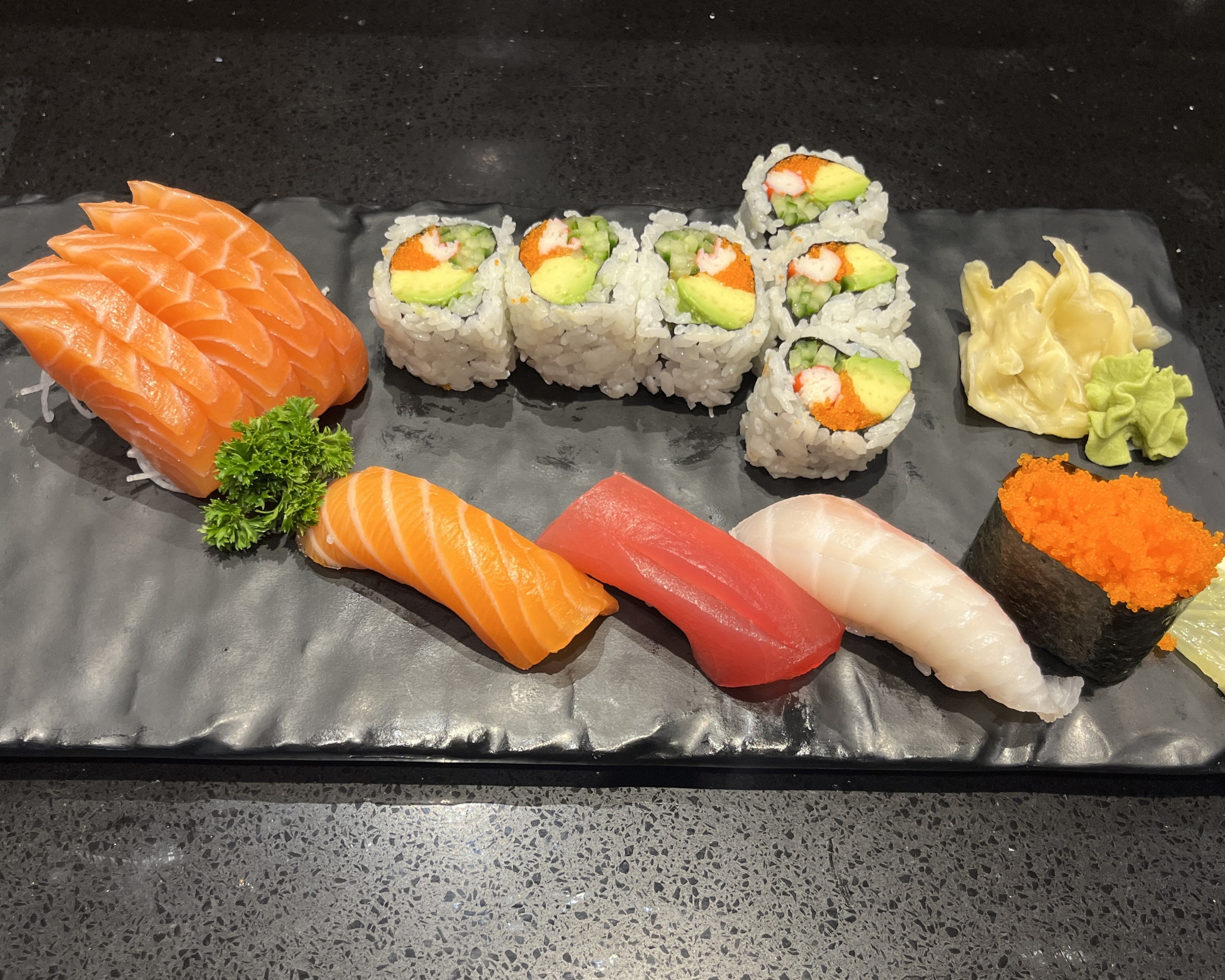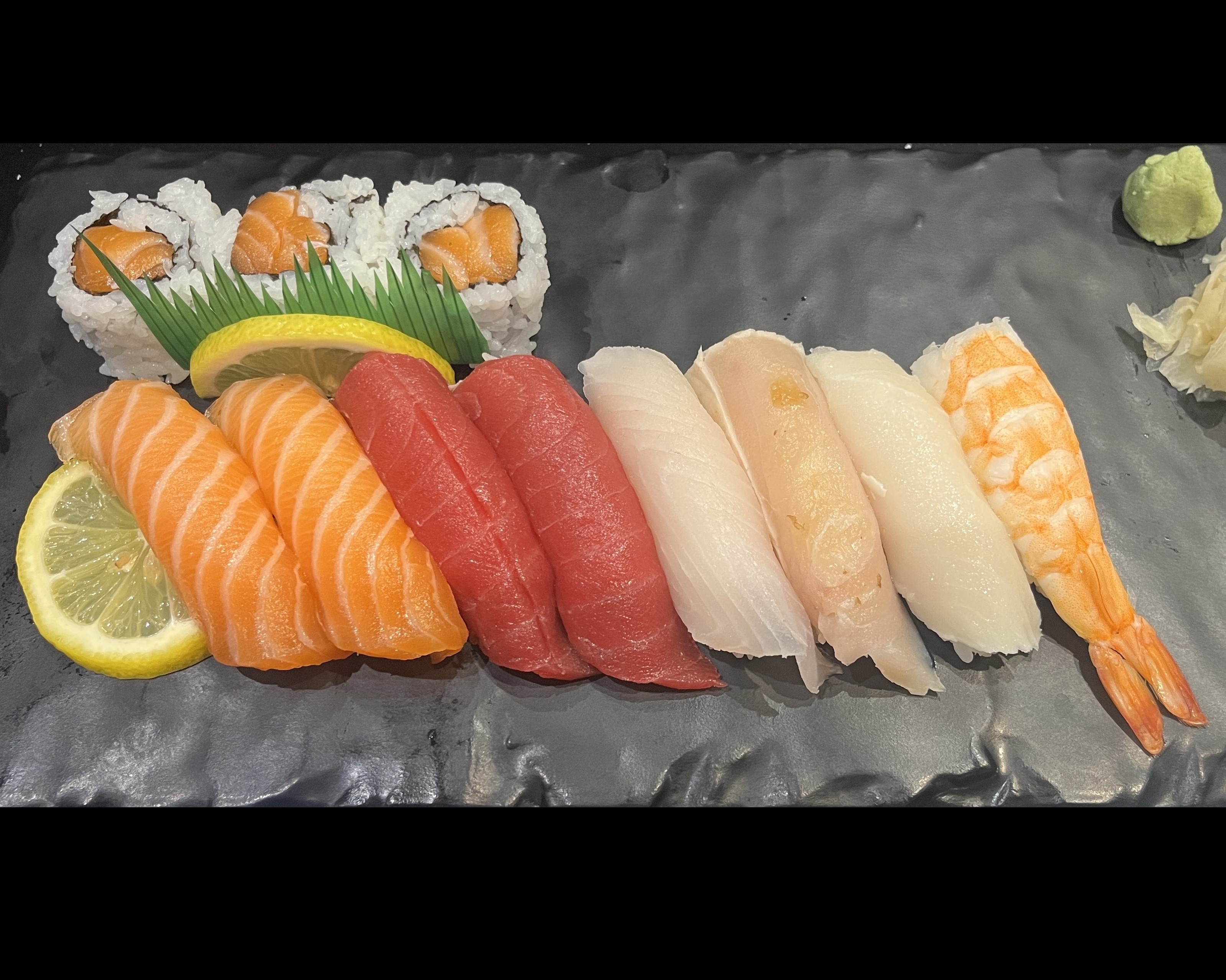 5pcs salmon sashimi, 4 pcs nigiri sushi, 3pcs shrimp tempura, 6pcs California maki (rice not included)
