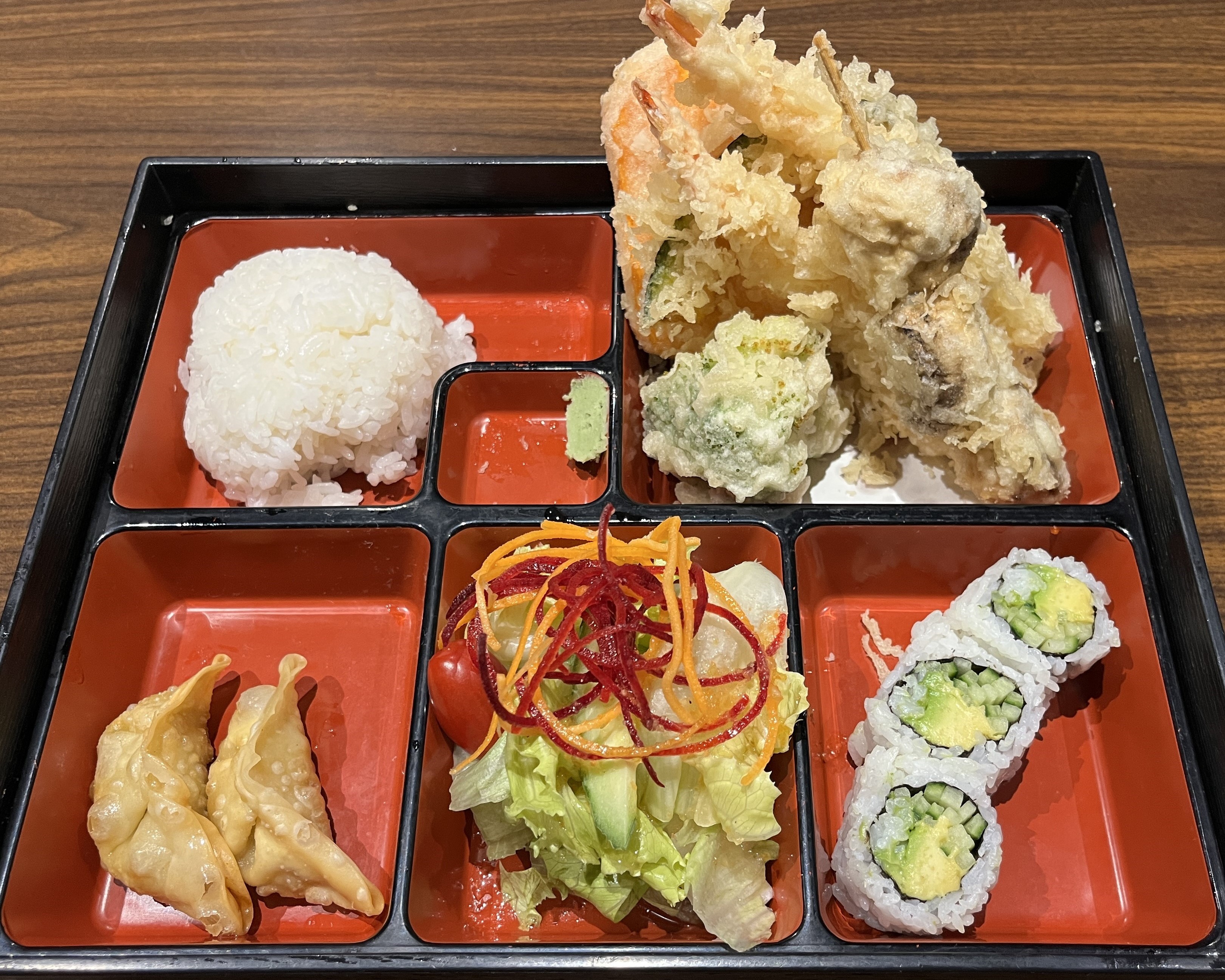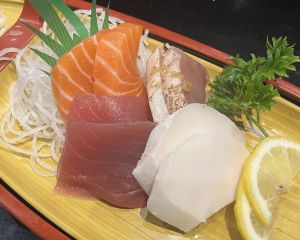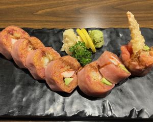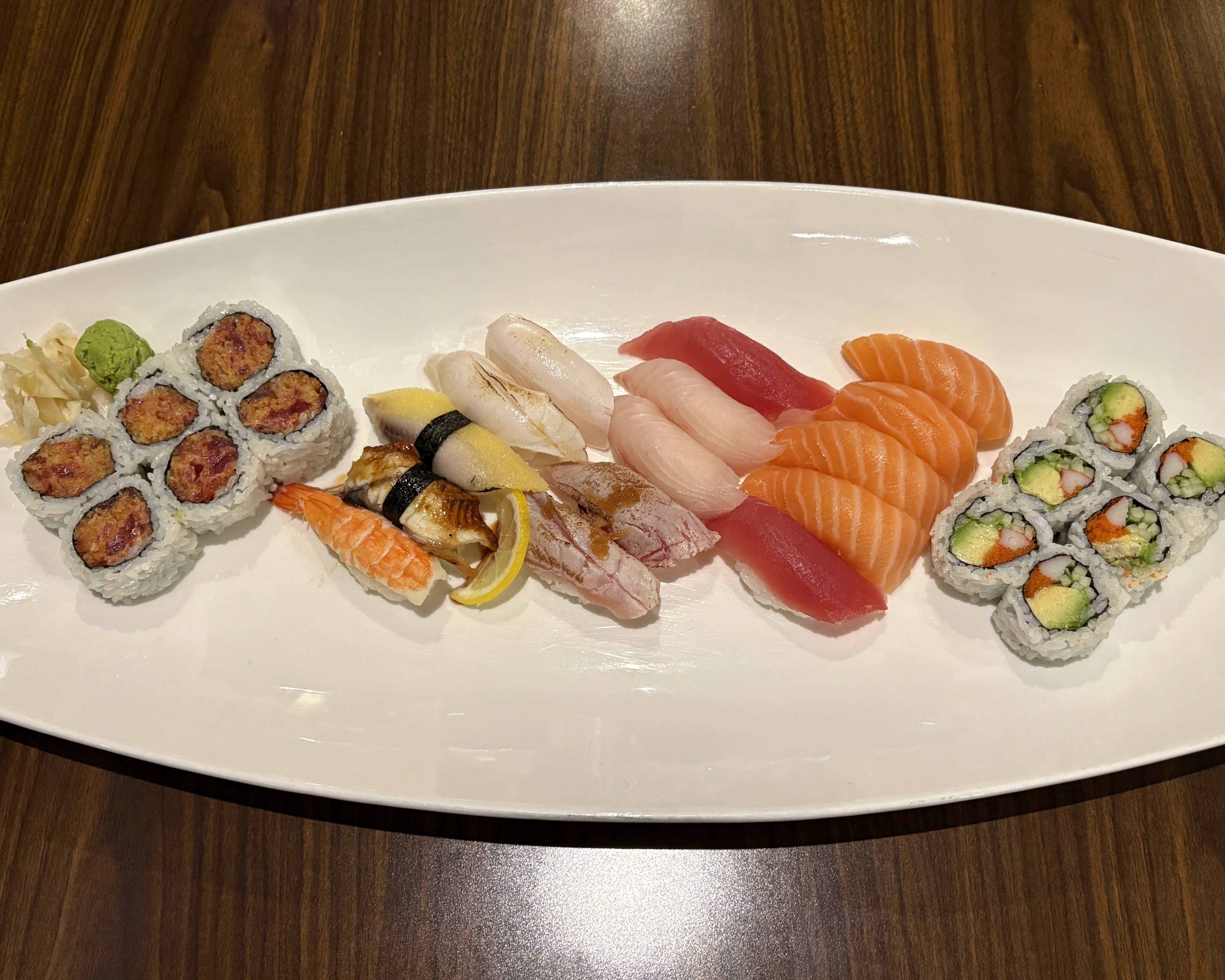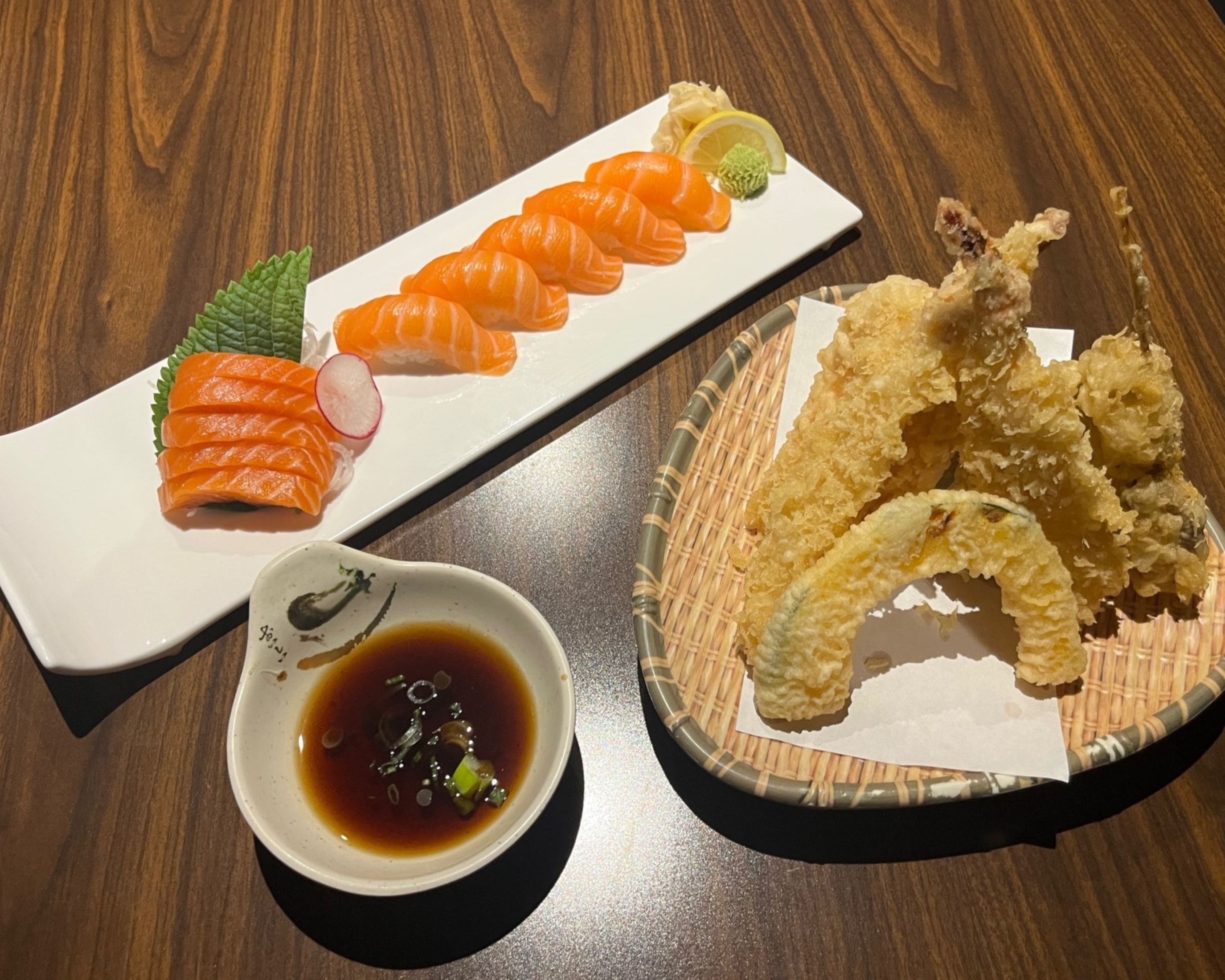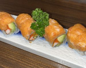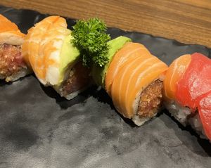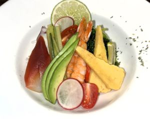 5pcs salmon sashimi, 4 pcs nigiri sushi, 3pcs shrimp tempura, 6pcs California maki (rice not included)