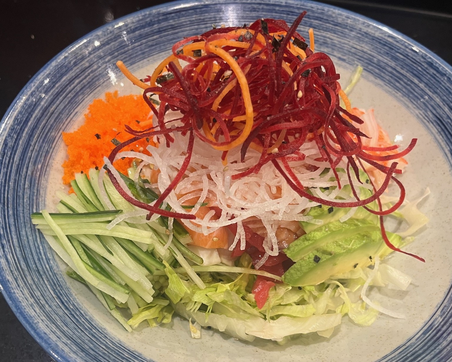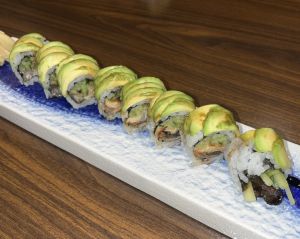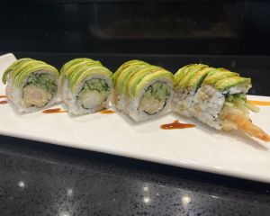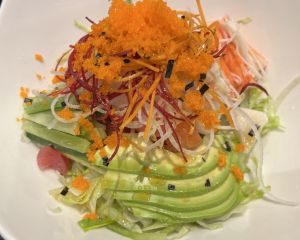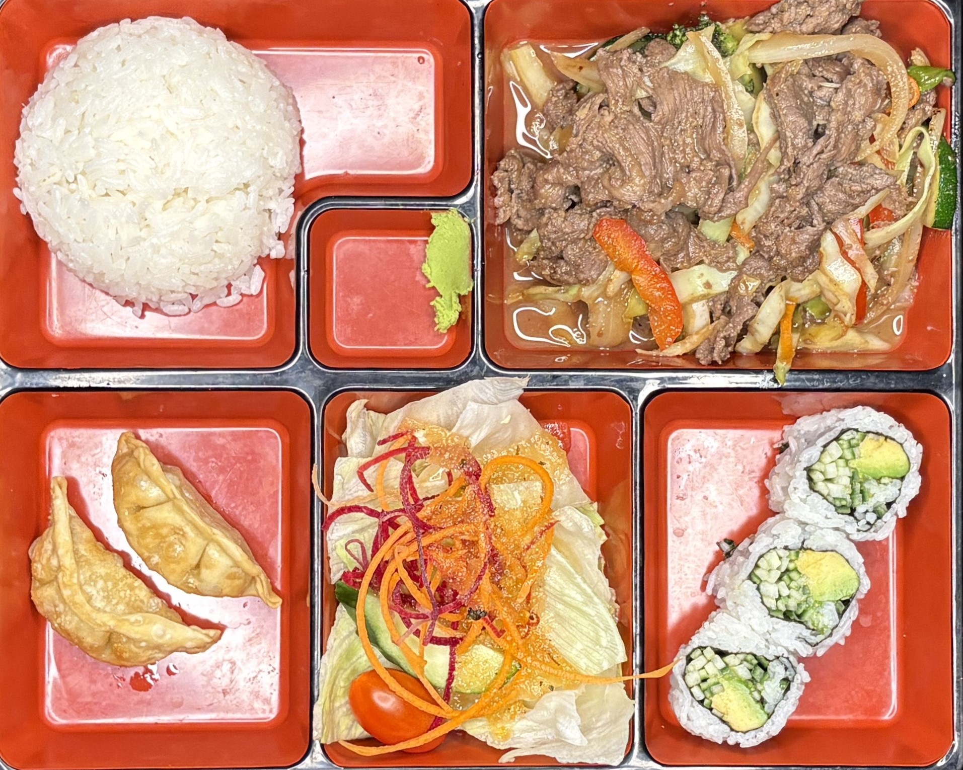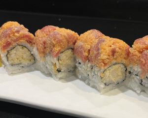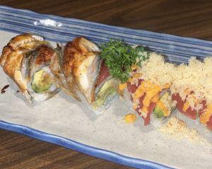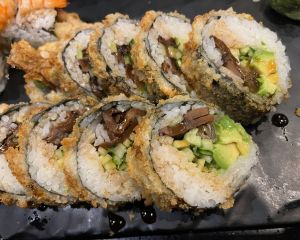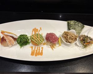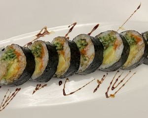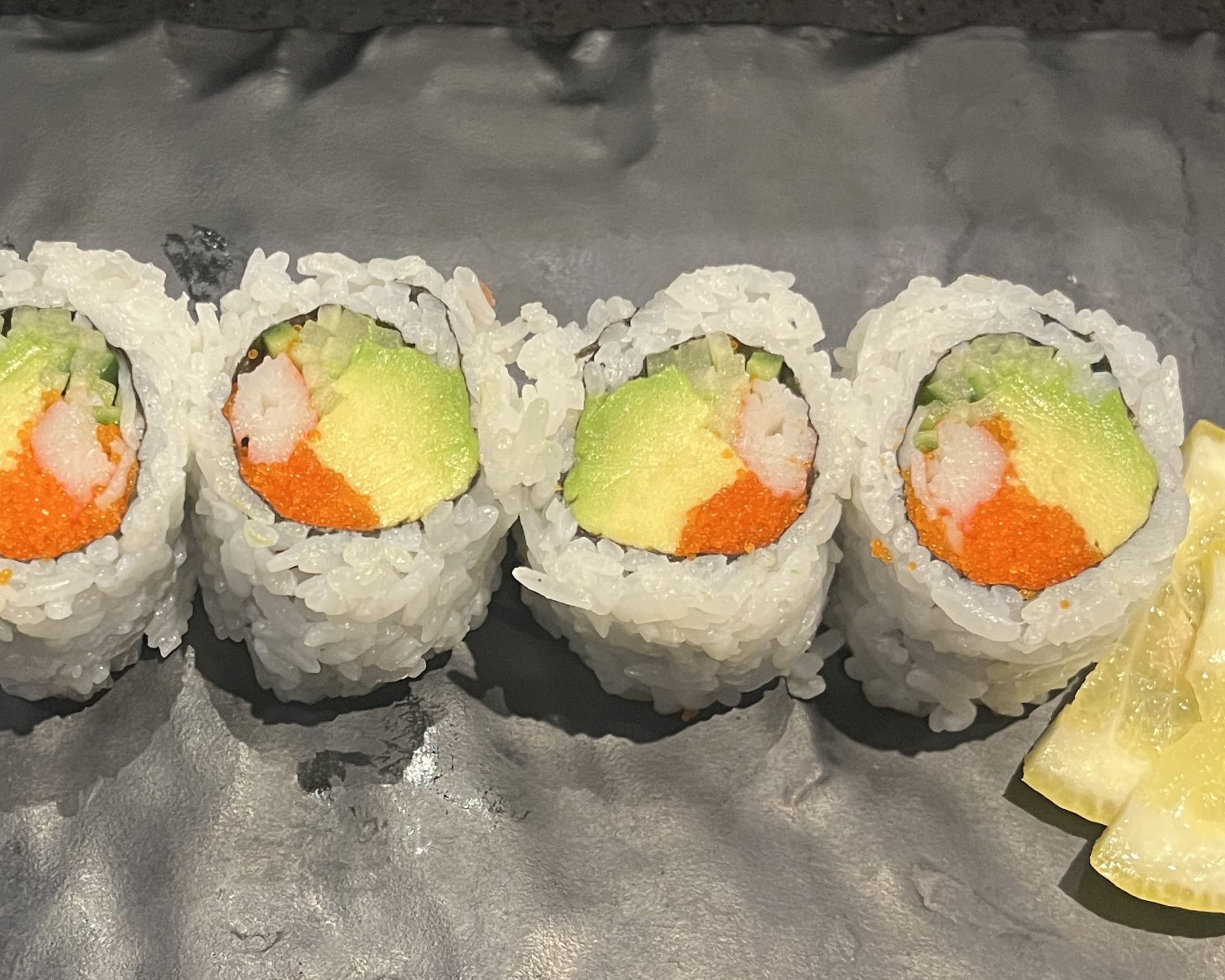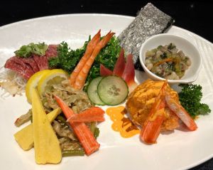 5pcs salmon sashimi, 4 pcs nigiri sushi, 3pcs shrimp tempura, 6pcs California maki (rice not included)