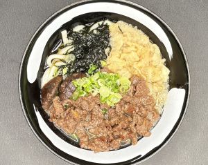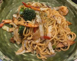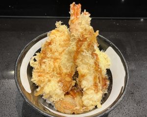 Stir fried marinated sliced beef rib-eye, 3 pcs shrimp tempura, 3pcs