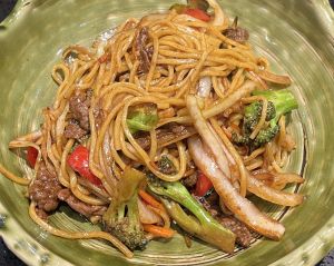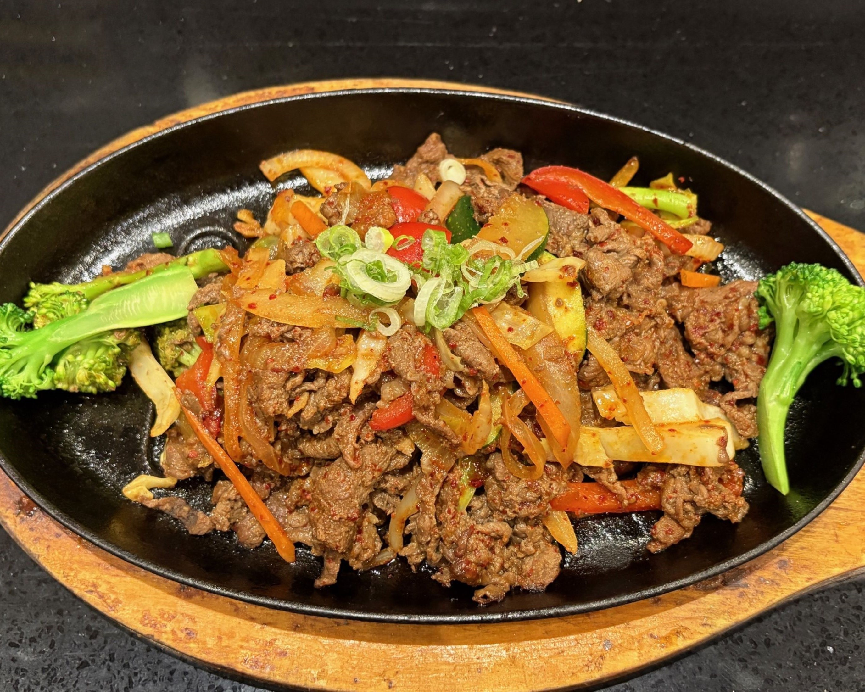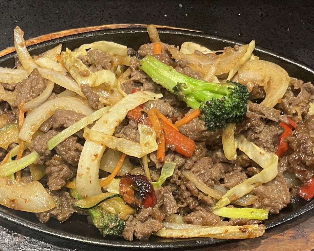 Stir fried marinated sliced beef rib-eye, vegetables, rice
