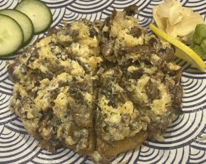 Shitake mushroom, crunch, mayo on crispy rice patty