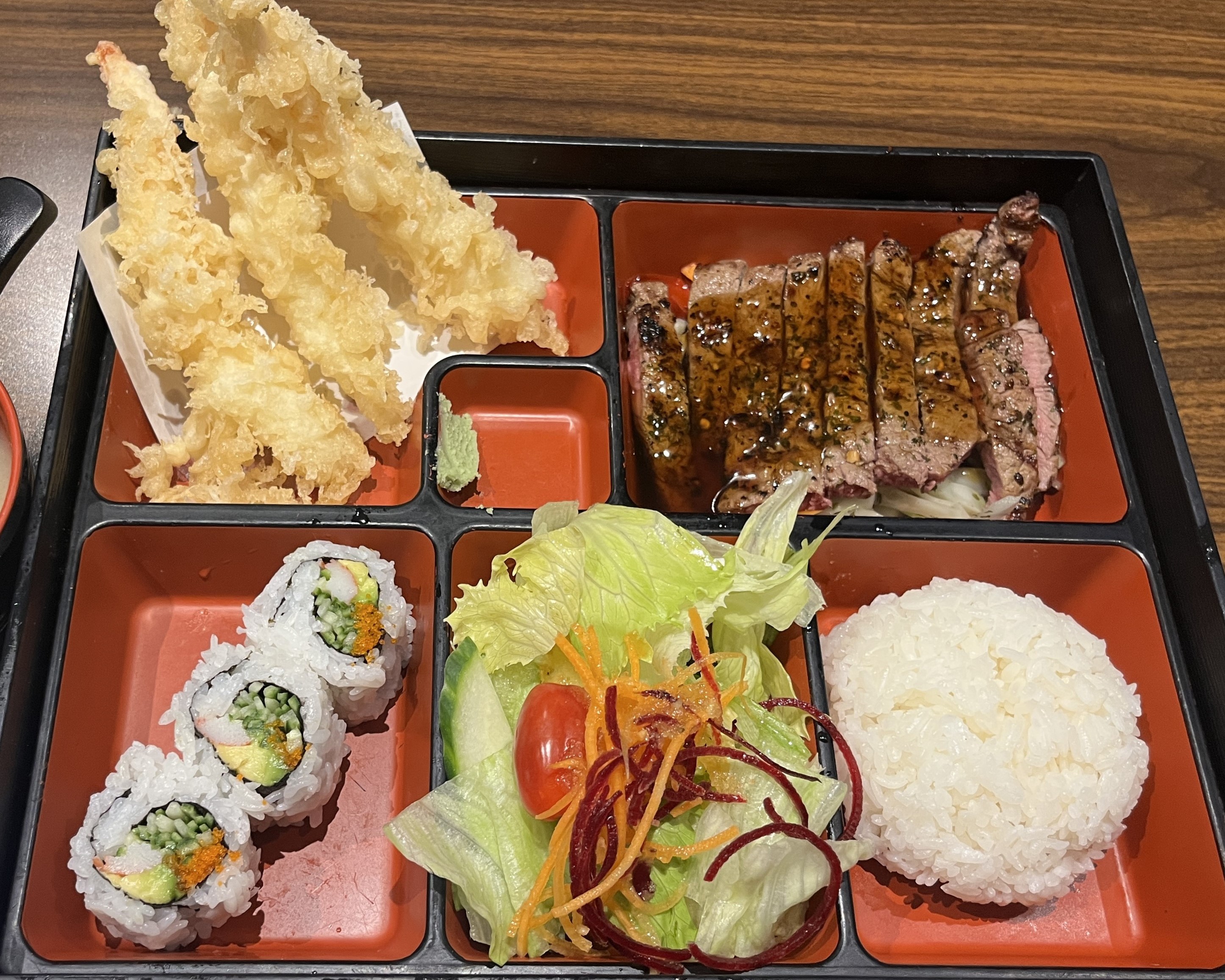 Grilled stir-fried striploin with teriyaki sauce, 3pcs shrimp tempura,
